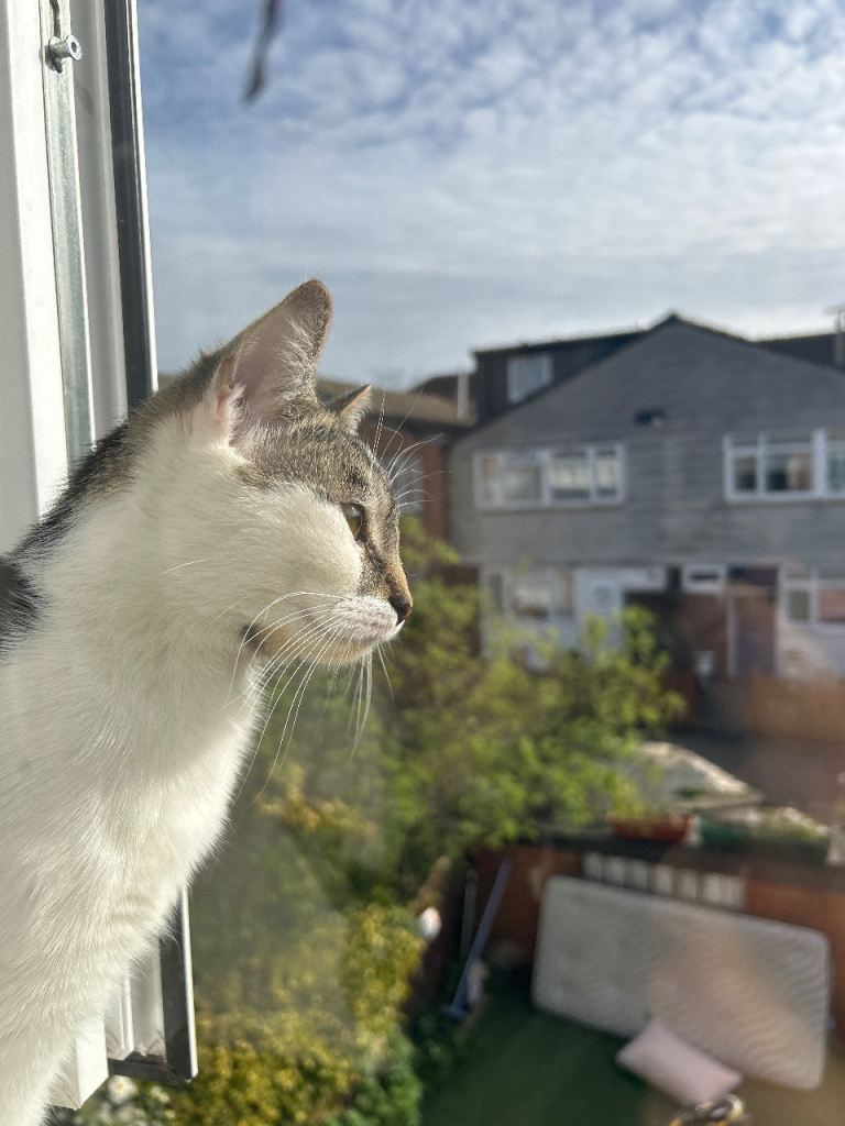 He is litter trained and used to living in a home environment. He likes relaxing, exploring, and playing like most young cats. He would suit someone who can give him attention and a safe, loving home.