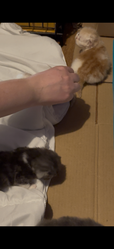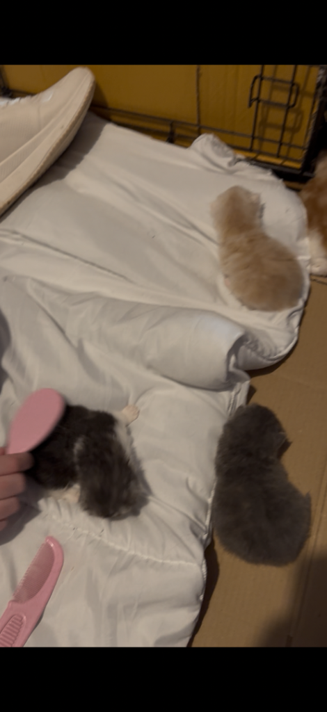 Kittens will come very well handled and used to being groomed and having their eyes cleaned etc. They are well used to human touch and being brushed already. (See pictures)