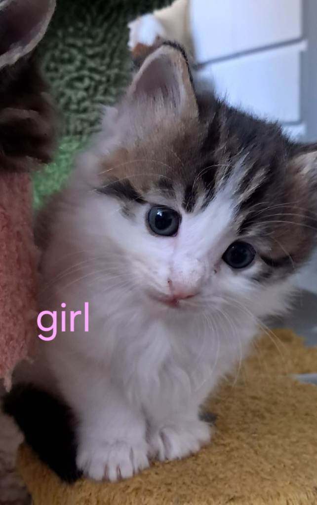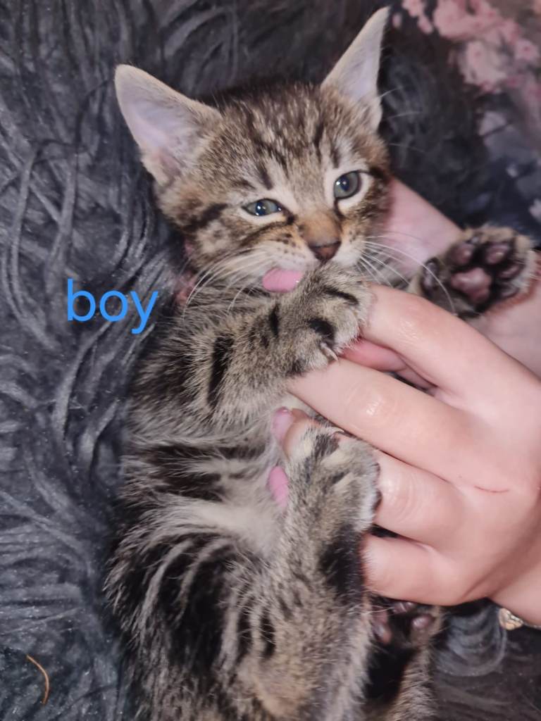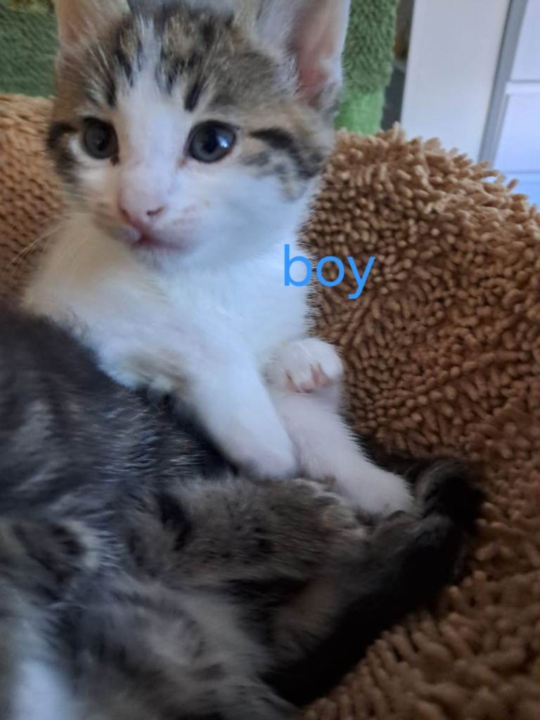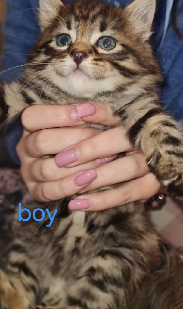 They indepentently use the litter box and eat kitten food. They are very active and love to cuddle. The kittens are mixed breed with long hair, bengal and tabby.