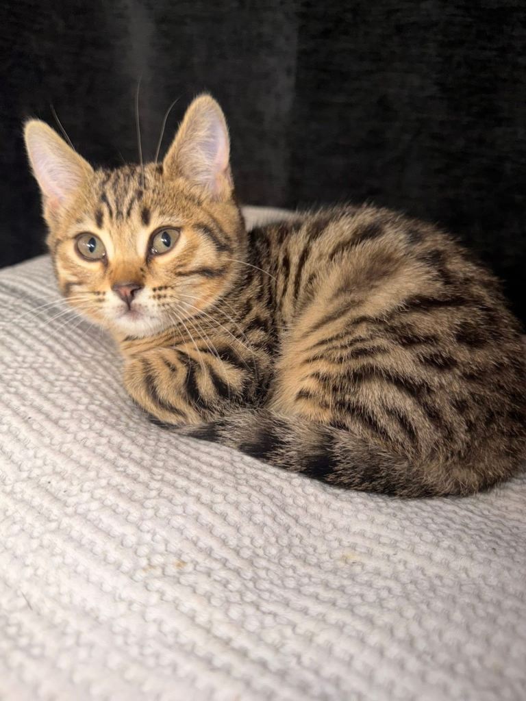 A wonderful mix of Bengal markings and British Shorthair temperament — playful, affectionate and full of character.
