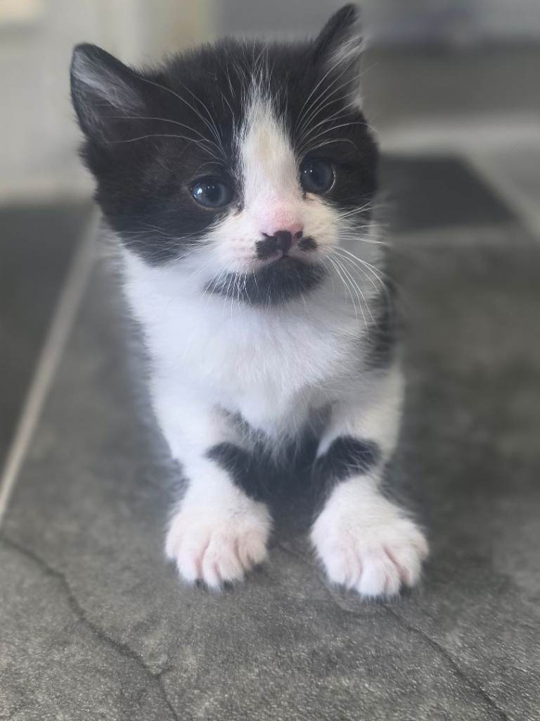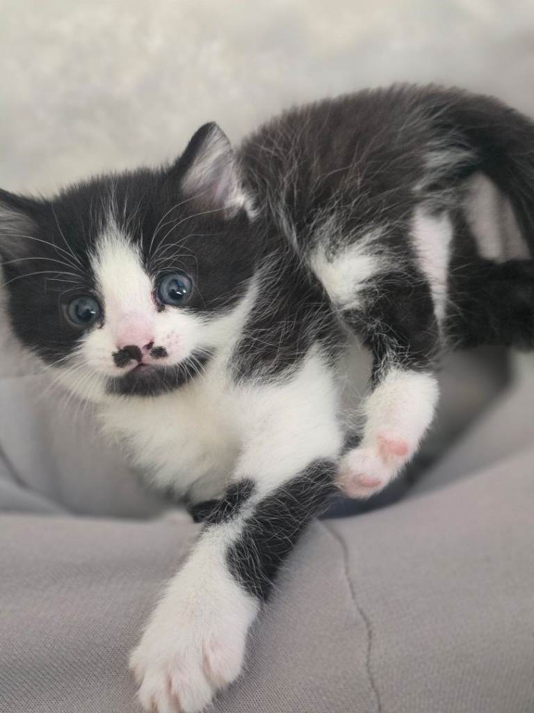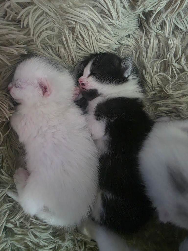 The white kittens currently have faint grey smudge “ghost markings” on their heads. This is expected to fade as they grow, meaning they will likely become fully white. Both are showing bright blue eyes.