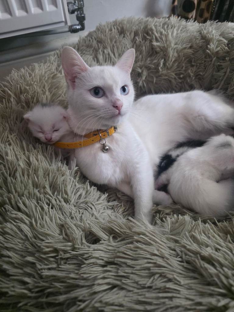 Mum is pure white with blue eyes, and dad is a British Blue cross. Kittens will also come with a small starter pack and a homemade birth certificate. Regular updates, photos, and videos will be provided as they grow. Serious enquiries only please – we want the very best homes for these babies.