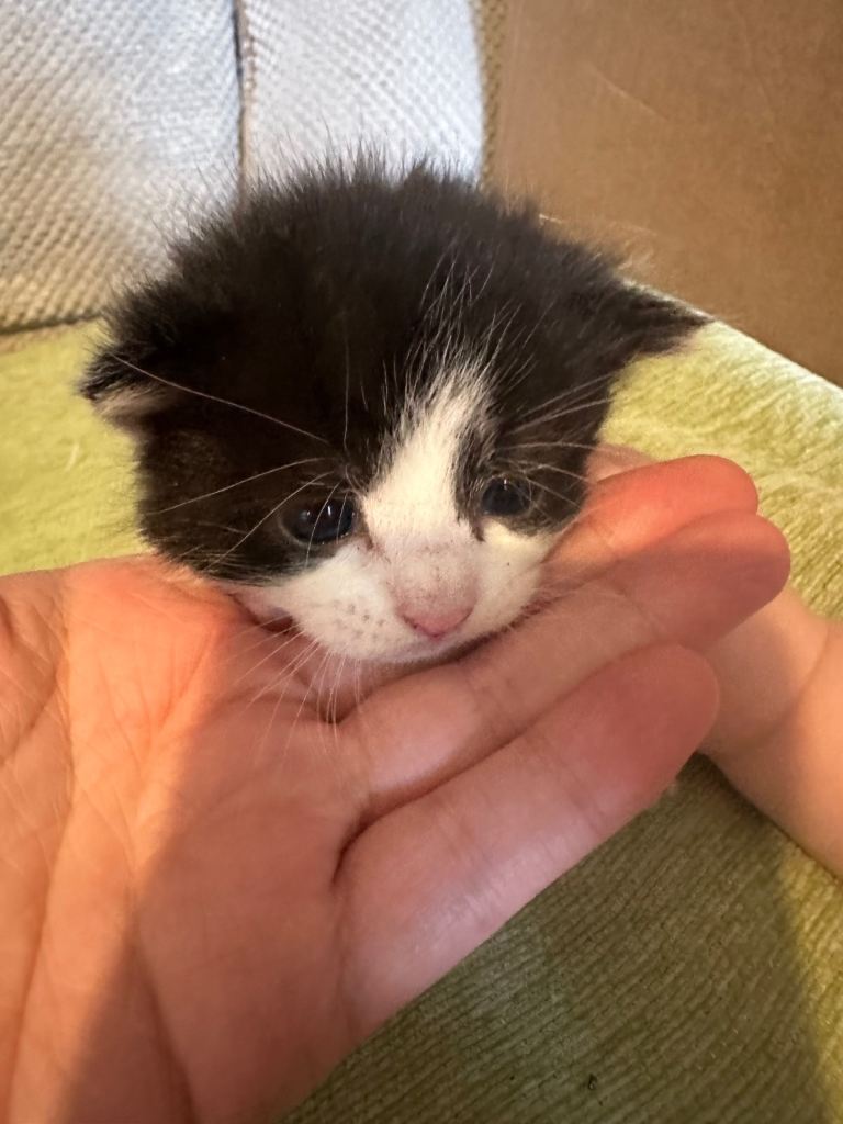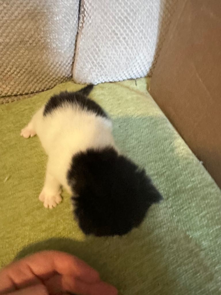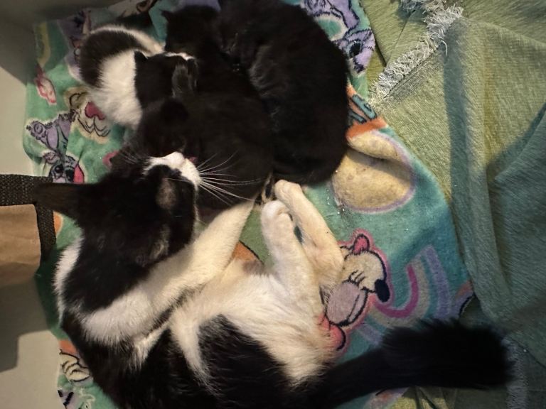 4 black and white kittens, 3 mostly black and 1 mostly white, ready from 14th may depending on them eating, 2 boys and 2 girls! £20 to secure your kitten