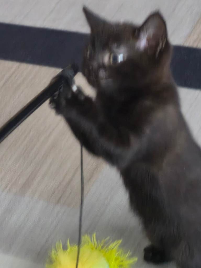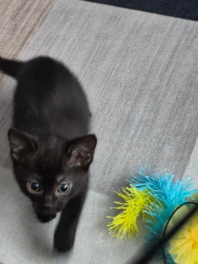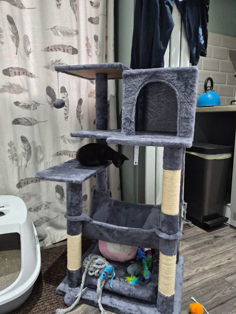 11 weeks old. Bought for my daughter 2 weeks ago and but she has no interest whatsoever Not overkeen on being picked up as yet but very loving when tired and comes to lay on you no hesitation. Quite shy. Needs someone with lots of time as we are out a lot of the day so not getting attention she needs. Very playful. Comes with tower, food, toys. Litter tray can be included. Wormed and flead.