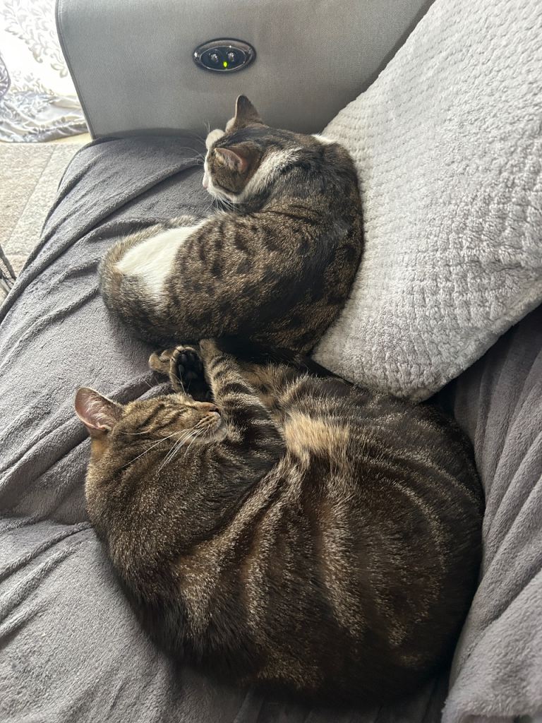 Chimi 2yr old full tabby and Chester 1yr old tabby and white both need rehoming. Home more important than price!!Ideally both to go together. Both had health checks and fine, i've had both from kittens and you couldn't meet friendlier boys, only rehoming as my health is declining. Both are indoors currently and love to play with each other and relax on the sofa. Chester loves his nightime cuddles next to you. I just want to find them a loving home! Thank you for reading.
