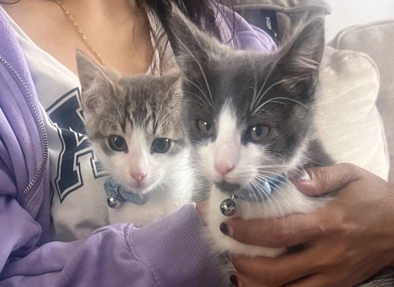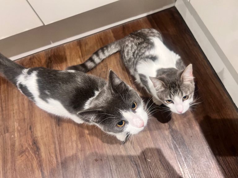 They are 9-month-old brothers and have been together since birth, so they must be rehomed together. I’ve had them since they were 8 weeks old and they’ve been raised around other cats, birds, and young children.