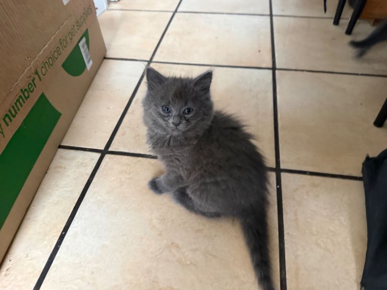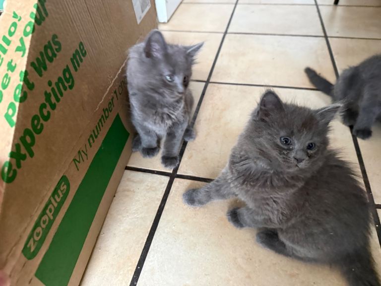 2 gray and black Charteux kittens looking beautiful fluffy playful ready to to adopt eating solid food and litter trained