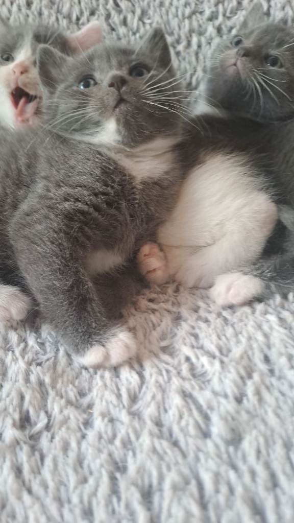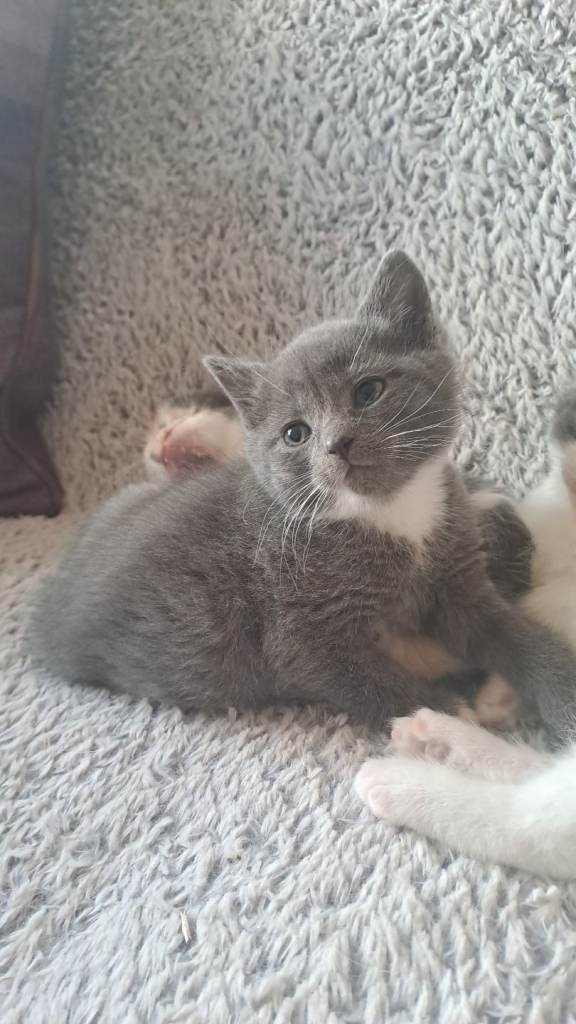 2 gorgeous kittens for sale. Both chunky and healthy. 1 grey with a black nose, white paws and bib and the other, very rare, diluted calico (grey, peach and white)