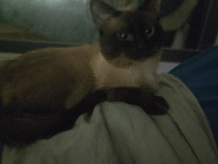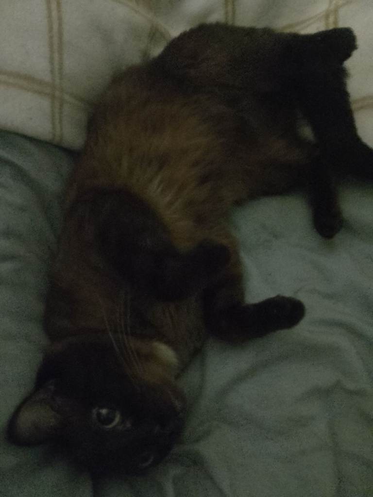 Milo is the dark brown/black loving cat very protective over his brother. Loves getting rubbed.