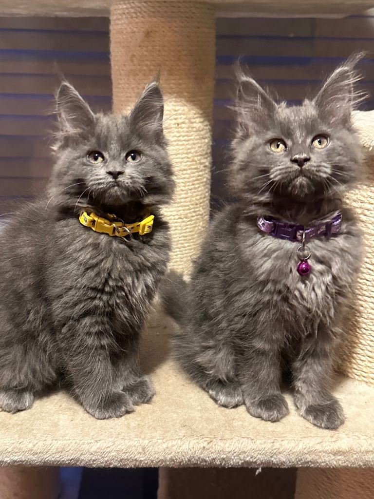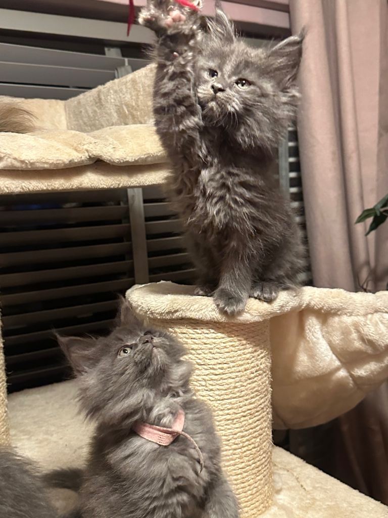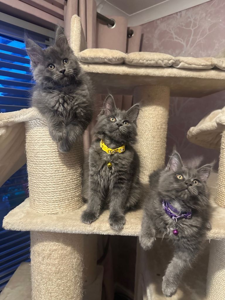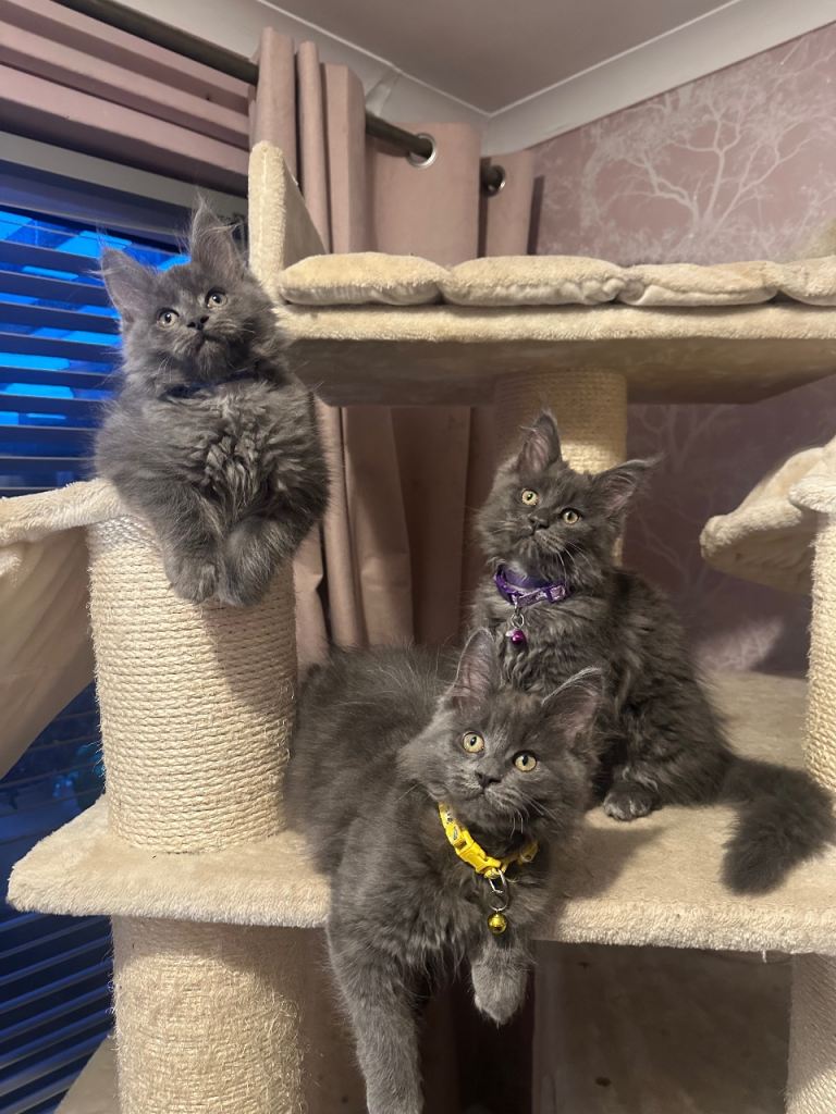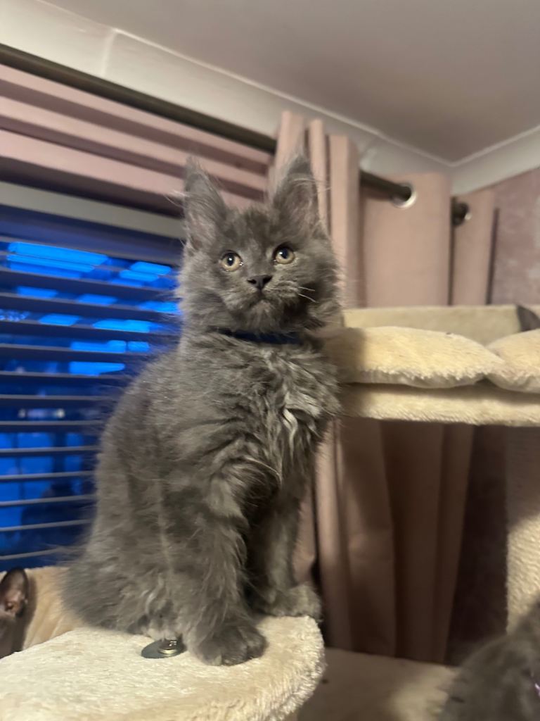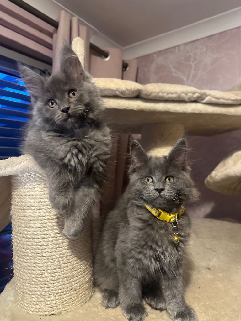 Blue Maine Coon Kittens – Exceptional Russian Lines – Active TICA Registered ✨ We have 3 beautiful Maine Coon kittens left available. Mum comes from Russian-imported, extra-large lines, and both parents are from excellent pedigrees. Born 20/10/2025, they are 10 weeks old and have had their first vaccination. They are due their second vaccine & microchip on the 21st January. Happy for them to leave now but you will have to arrange second jab and microchip yourself. ✔ What’s Included • Full vaccinations (course completed) • Microchipped • 5 weeks free insurance • Fully TICA registered – no restrictions for active papers price • Vet checked • Kitten pack 🌟 Kittens Available • 2 Solid Blue Boys