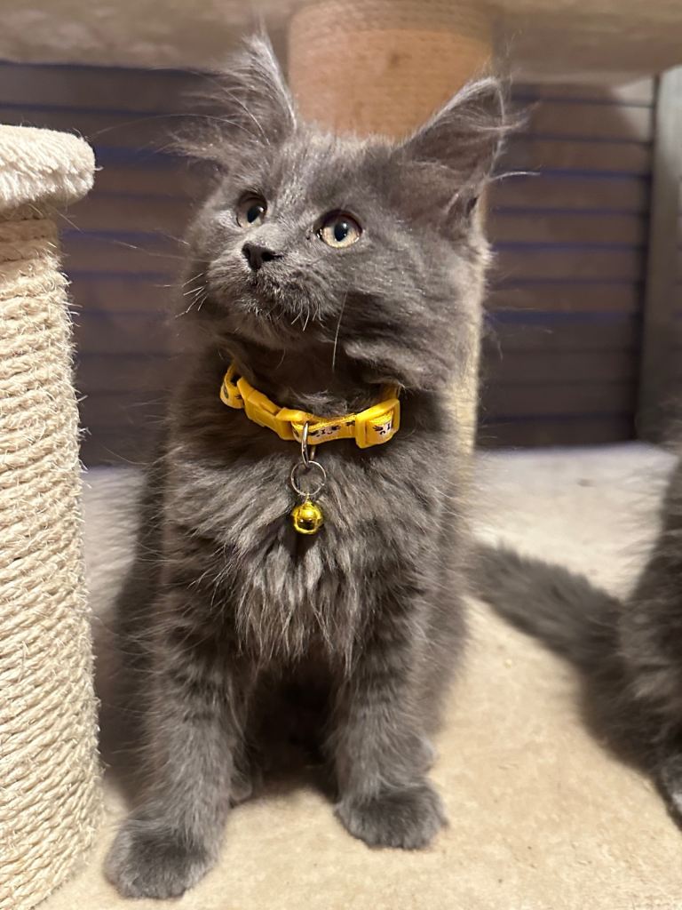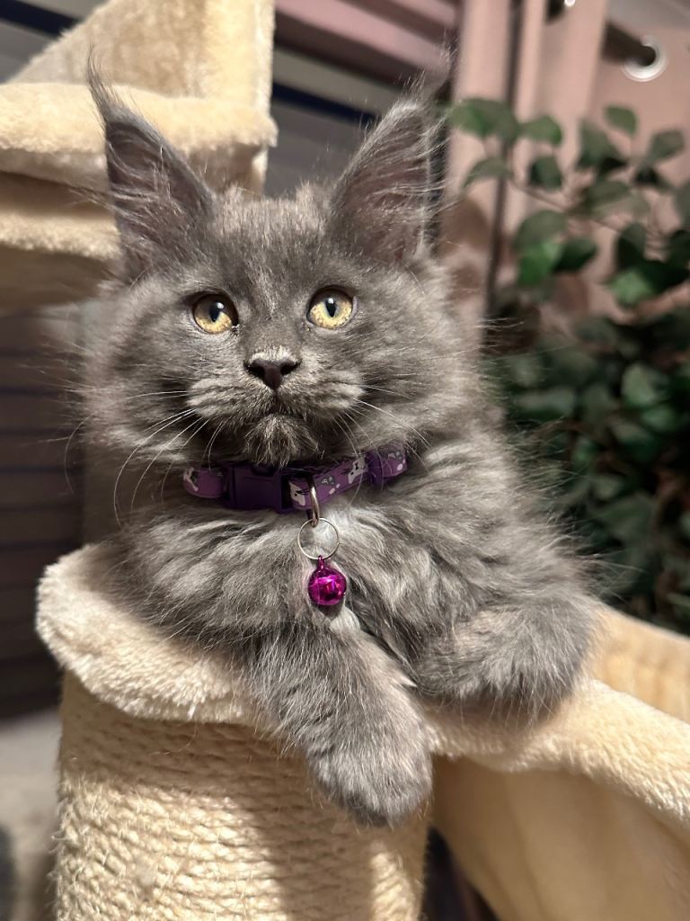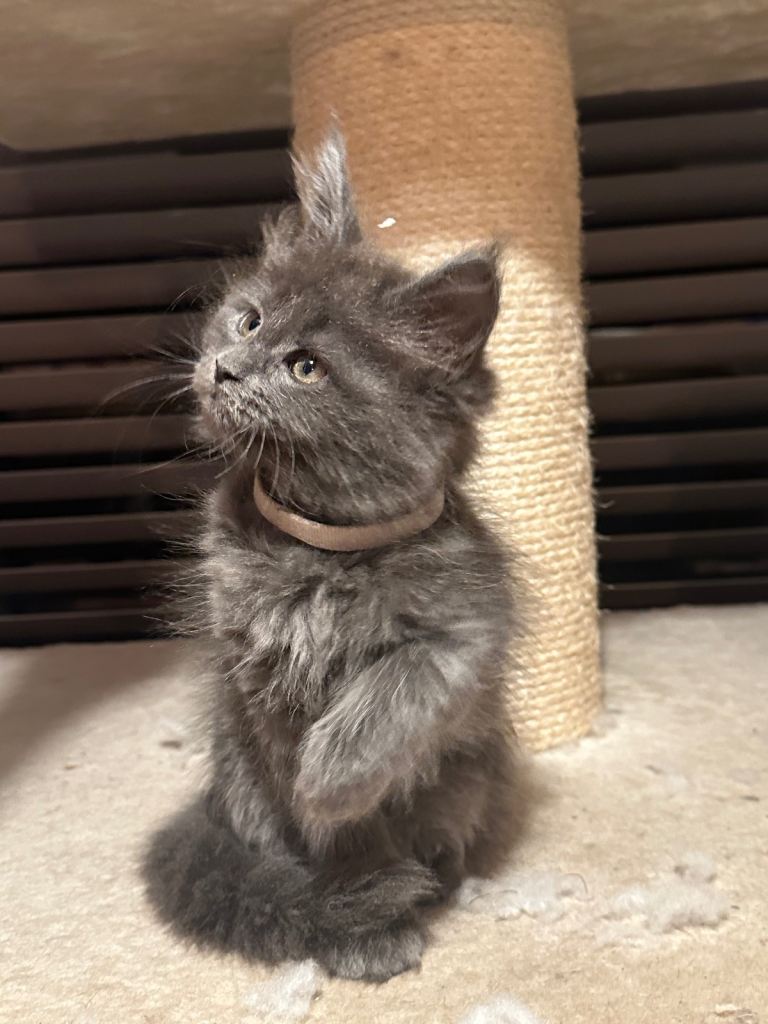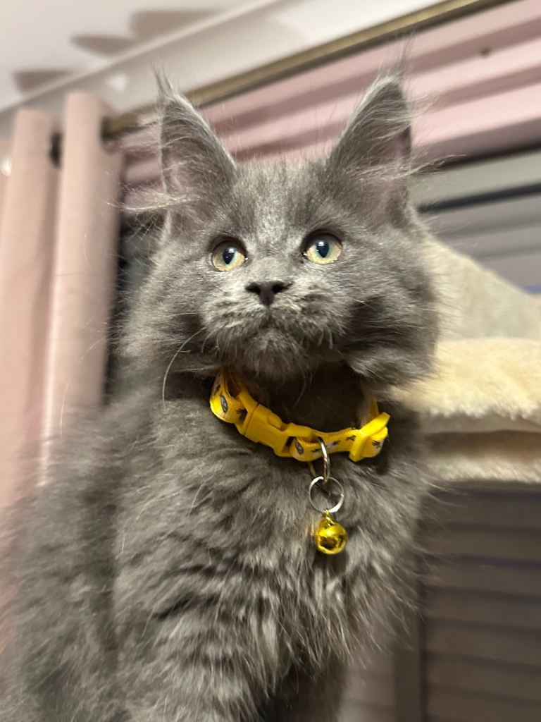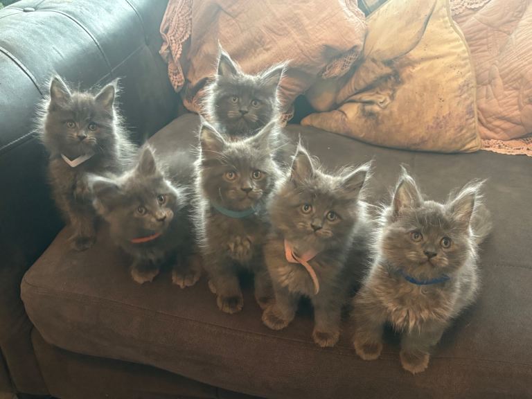 • 1 Blue Smoke Girl sold (pink collar) – incredibly striking and a superb example of the breed 🏡 Raised in a Busy, Loving Home Mum is our beloved family pet and can be seen with the kittens. Dad is a carefully selected stud. Our kittens grow up in a home with children of all ages and Great Danes, so they are exceptionally well-socialised, confident, cuddly, and very outgoing. 💎 Quality These kittens are raised with dedication and care. Their price reflects their health, pedigree quality, type, and the work invested in producing healthy, confident Maine Coons. They are good enough for breeding, active papers being £2500 and would also make incredible family pets £2000. 💰 we will require a £500 deposit to secure and hold the kitten of your choice, this is non refundable if you was to change your mind.
