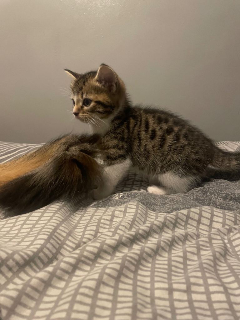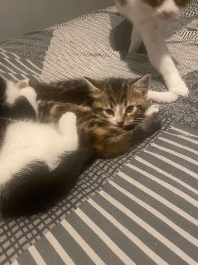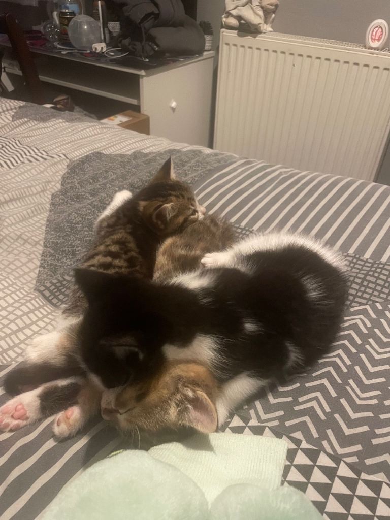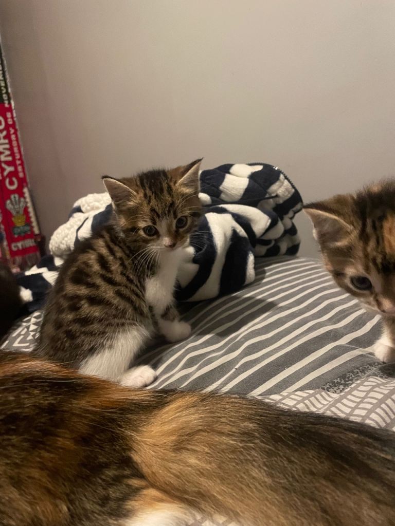I have 3 beautiful kittens. 1 male black+white. 1 girl tabby+white. 1 girl calico. They were born Thursday 29th of January and will be ready to go to their forever homes from Friday 3rd of April (9 weeks old). They will be flead and wormed ( 6+8 weeks). They are all very confident and happy babies, they have the full run of the house, they are never locked in a room. I’m a strong believer in leaving them explore and be free to learn life skills naturally and confidently. They are part of our family and get plenty of cwtches and love, they also interact with my other cats. They’re eating kitten biscuits and kitten wet food (whiskas wet food IAMS kitten biscuits) and they drink water. They all use the litter tray and I’ve not had any accidents as again I believe leaving them run free teaches them to seek the litter tray.