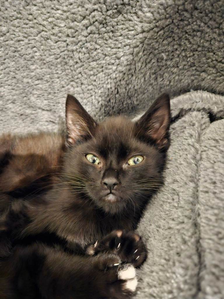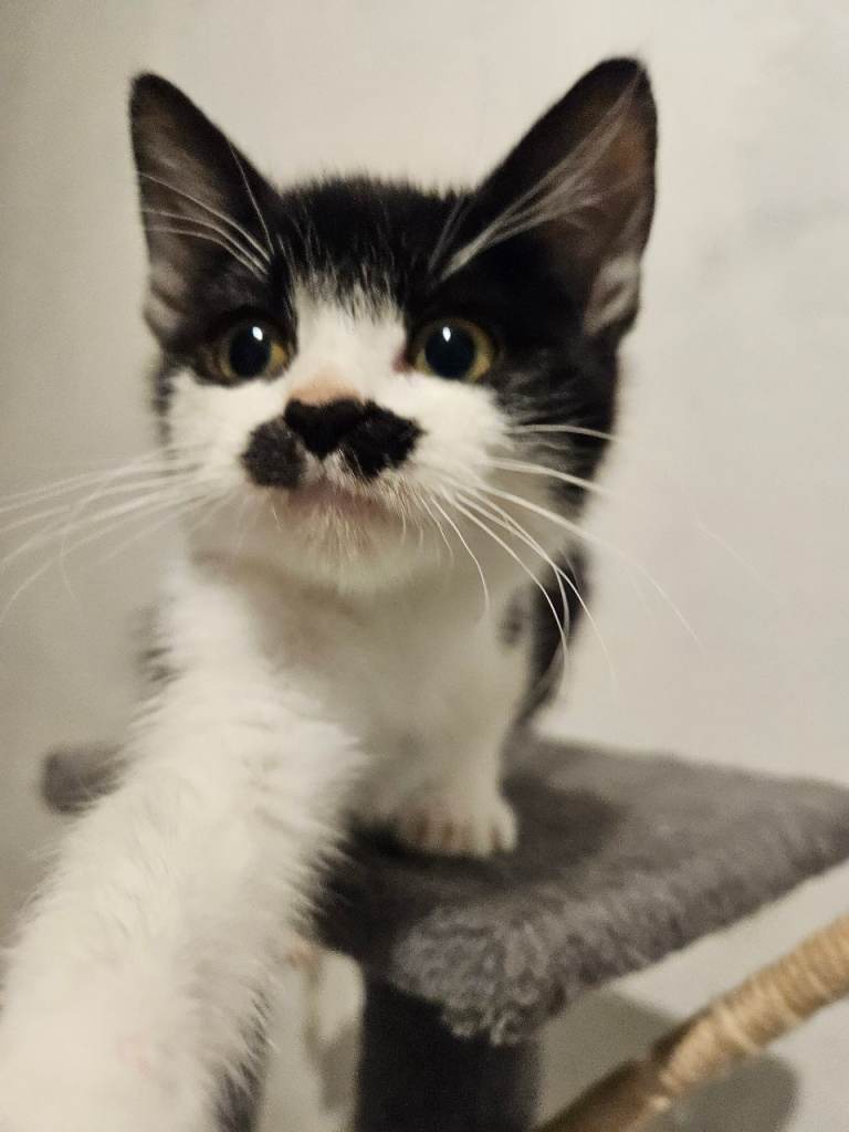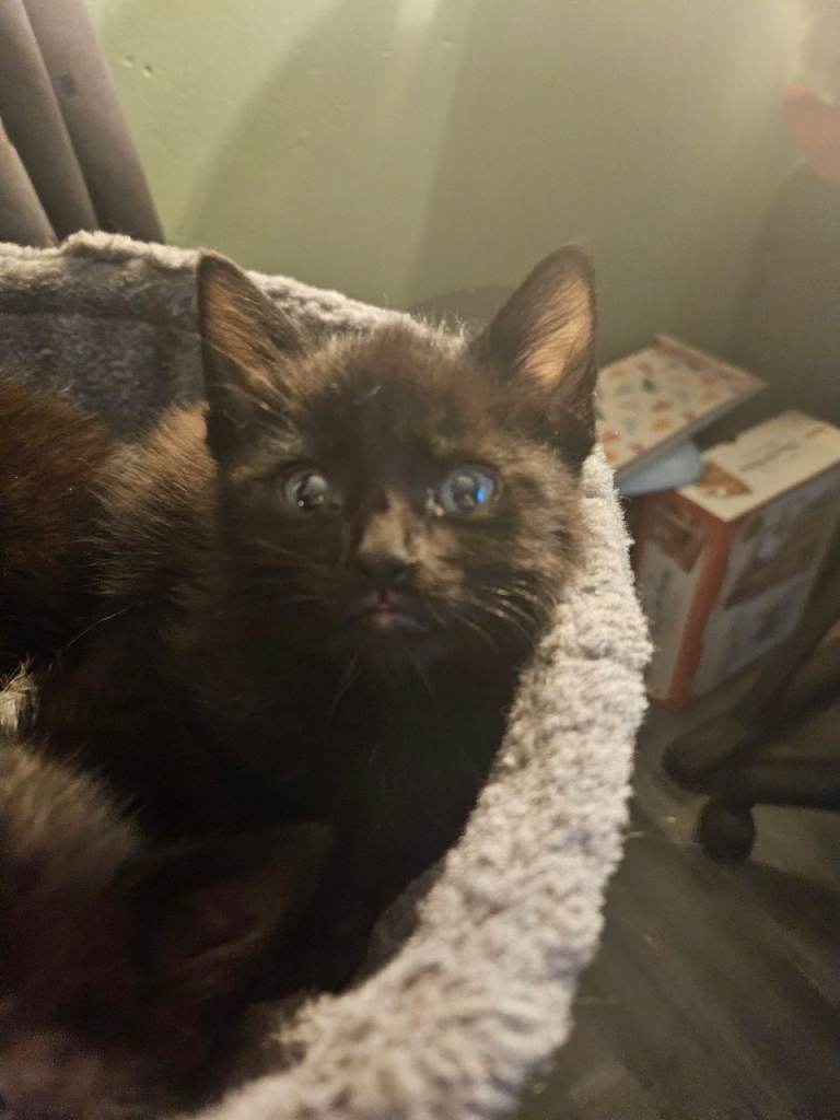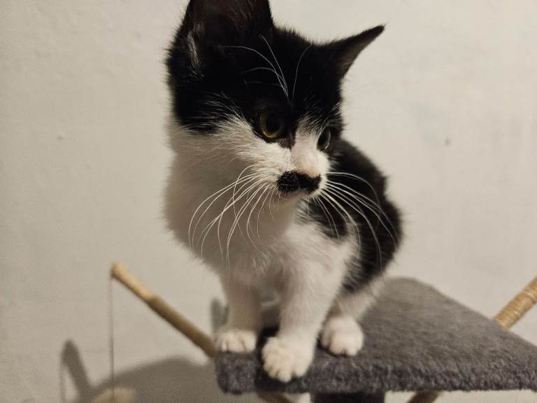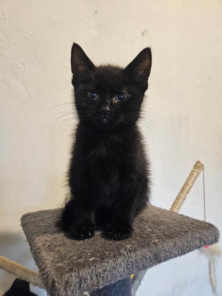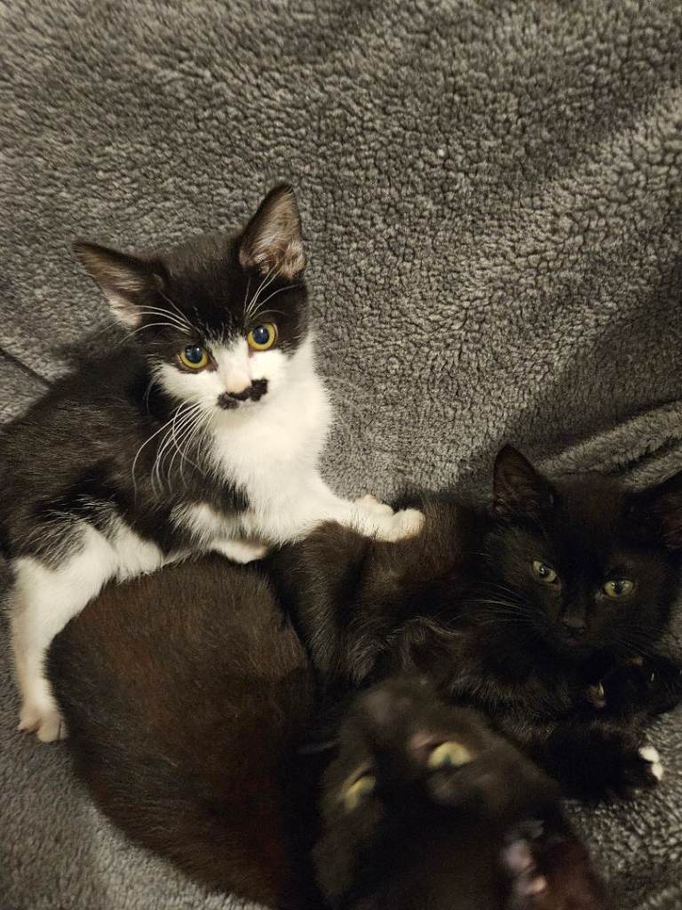 11 week old kittens, ready to leave now. 2 boys and 1 girl. Kitten with white is female, 2 black kittens are male. Fully weaned and litter trained. Very playful and good with other cats and children. They haven't had any interactions with dogs so not sure how they would react. Can deliver locally.