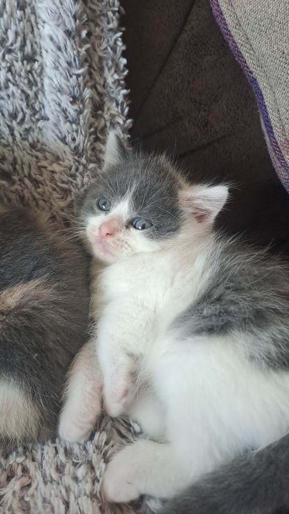 Also have a fluffy grey and white male kitten. Hes very chilled and cuddly. Relaxed and affectionate.