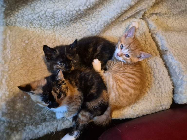 SOLD SORRY. 3no. 8wk old kittens for sale. 2 females (ginger and dark). 1 male (tri-colour). Three happy, boisterous kittens for sale (same litter). Mostly house trained (80% of the time). They have NOT seen a vet yet, but are all fully weaned, eating healthily...and often! They are all ready to go this weekend. Am happy to deliver (free) within 20 miles of G53 (further will discuss). £150 each.