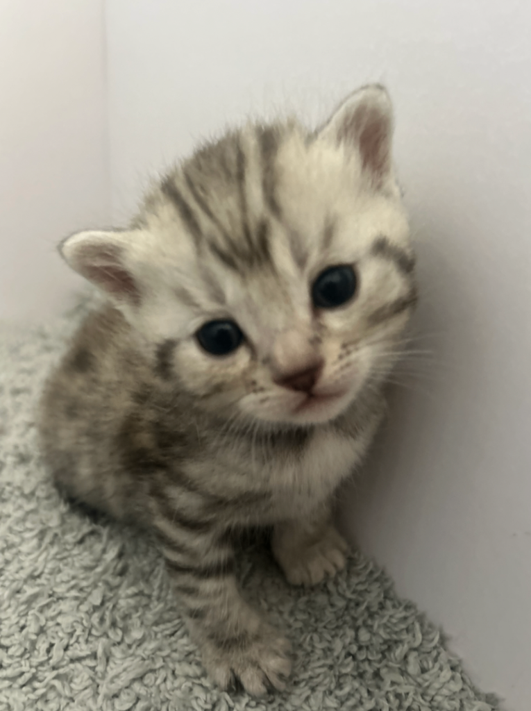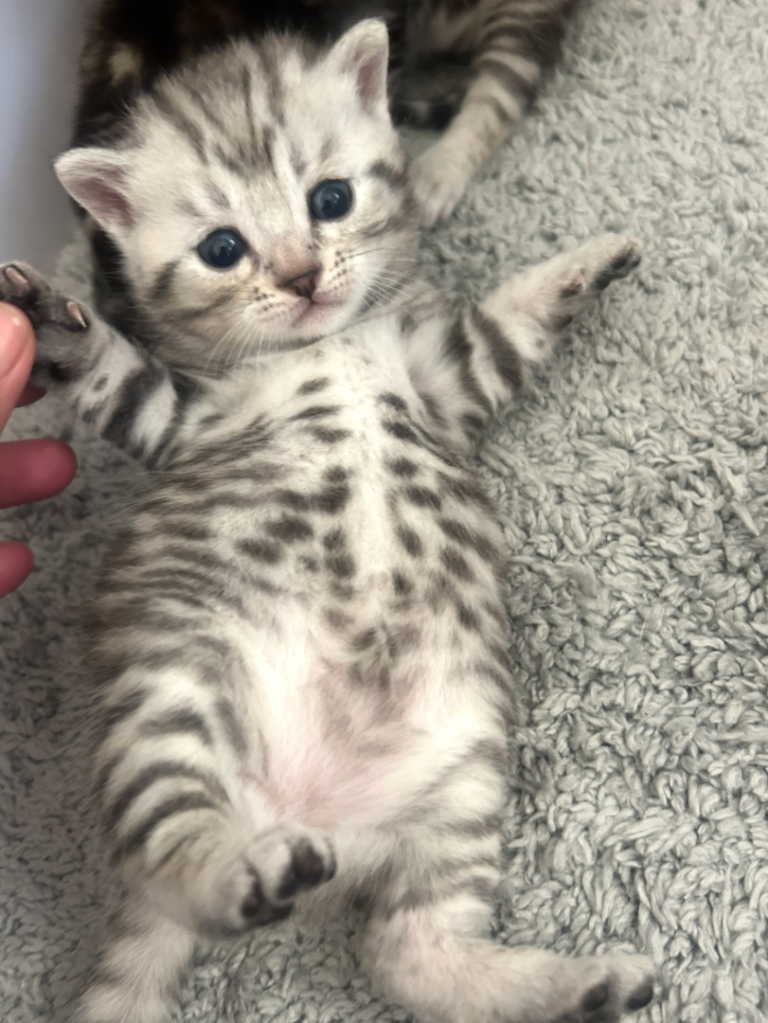 Silver Bengal with silver spotted/rosetted pattern. 285 g at 4 weeks