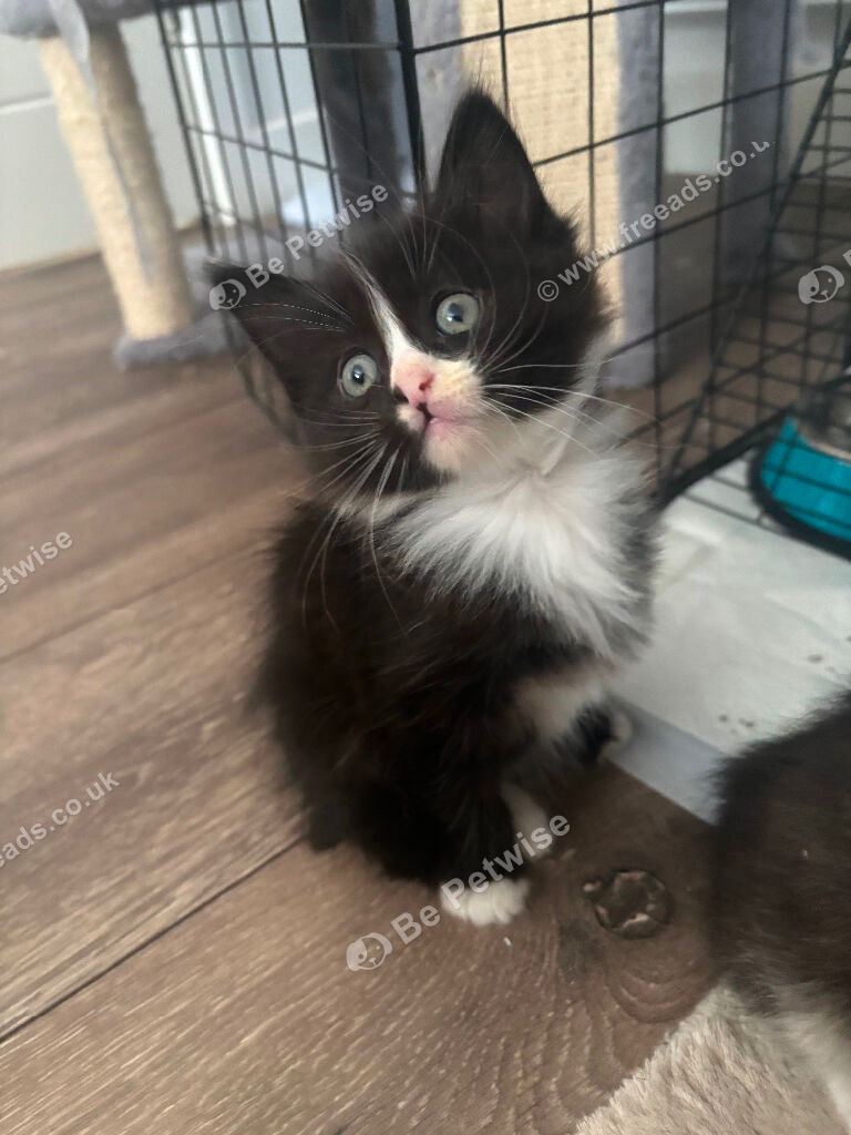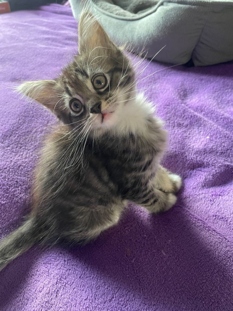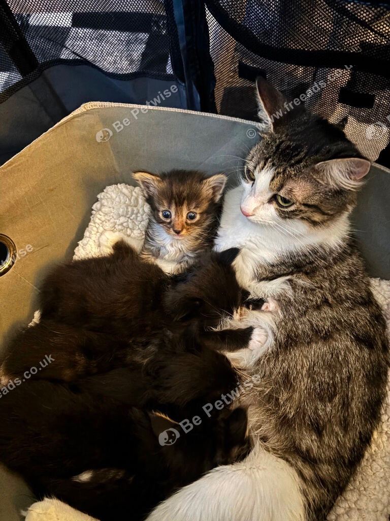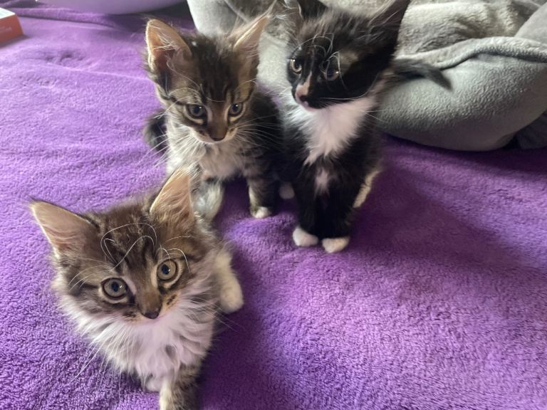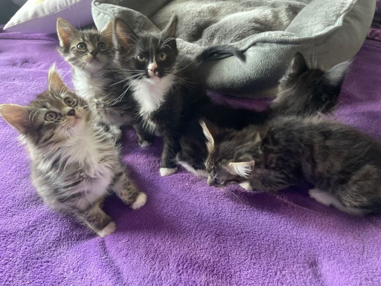 Our beautiful Ruby has had her first litter, 3 tabby and 3 black, white Smokey Maine coons. They are a delight love attention and cuddles. Dad is full Maine coon, and mam is 3/4 Maine coon. They kittens are thriving progressing great using litter tray, eating wet and dry love to play .?Will be flead and wormed, they are used to hoover etc. Looking for forever homes for these beautiful babies. 5star homes.