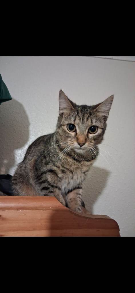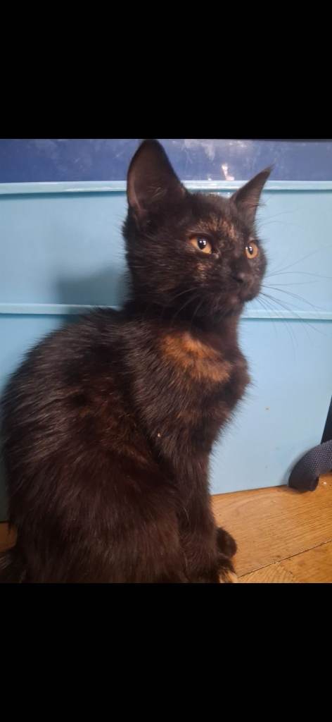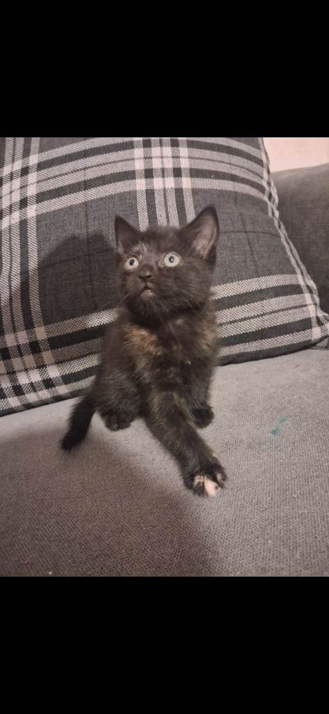 Tabby kittens with a bubbly personality, 3 have weaned from their mother 10 weeks and 2 are 9 months old. 2 kittens are black, the younger black kitten has patterns of brown on body and right paw. They are friendly. The older 2 are females one is neutered.