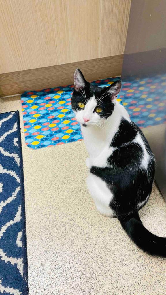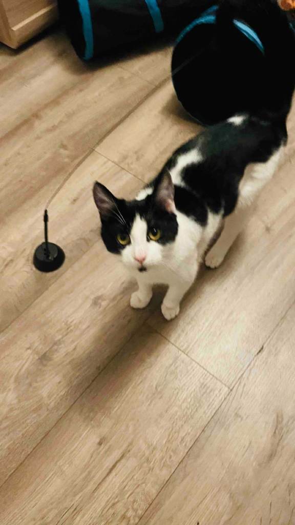 She likes to play with other cats and really enjoys having buddies around. She’s social in that gentle, easygoing way. She’s super easy to keep entertained, especially with interactive toys; anything that moves or makes a little noise grabs her attention right away.