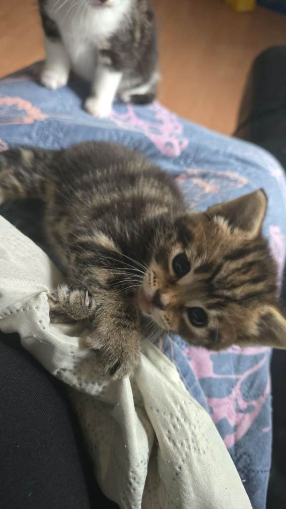 2, 8 week old tabby kittens for sale. They are looking for a good home. Both are curious, playful and friendly kittens.