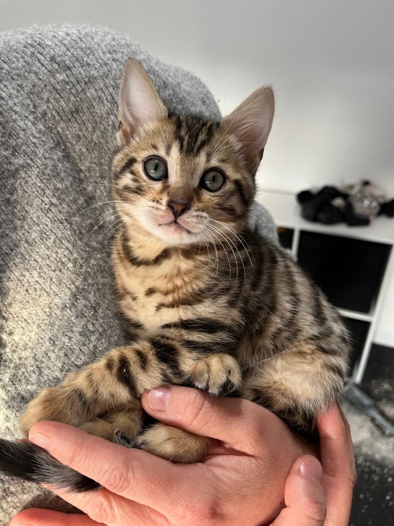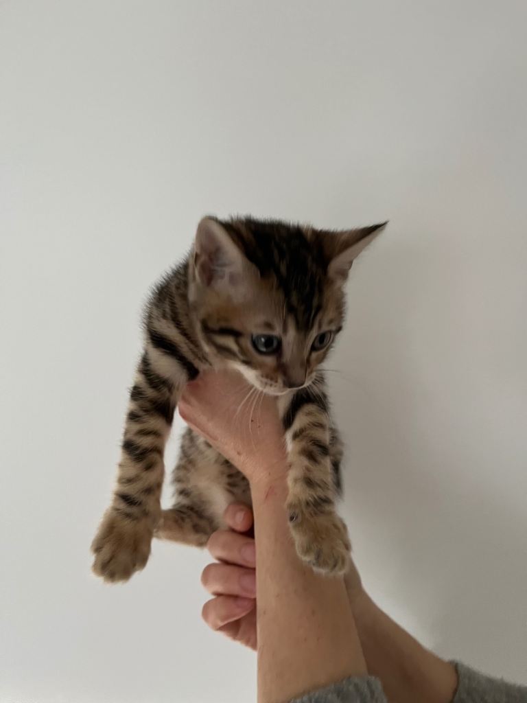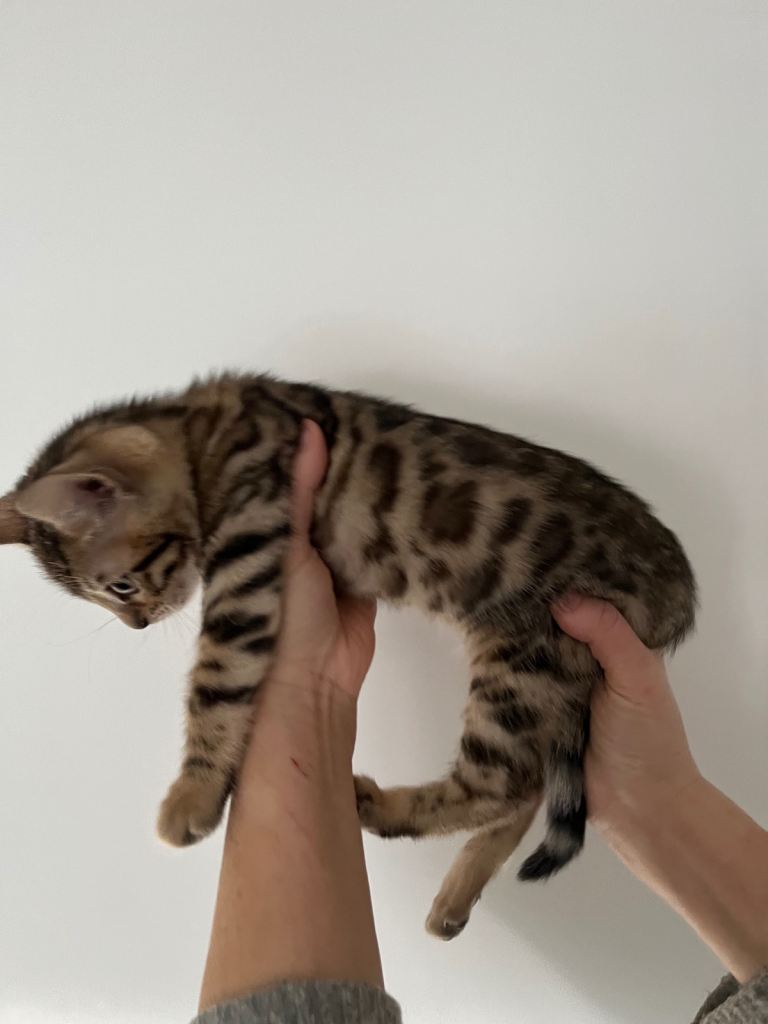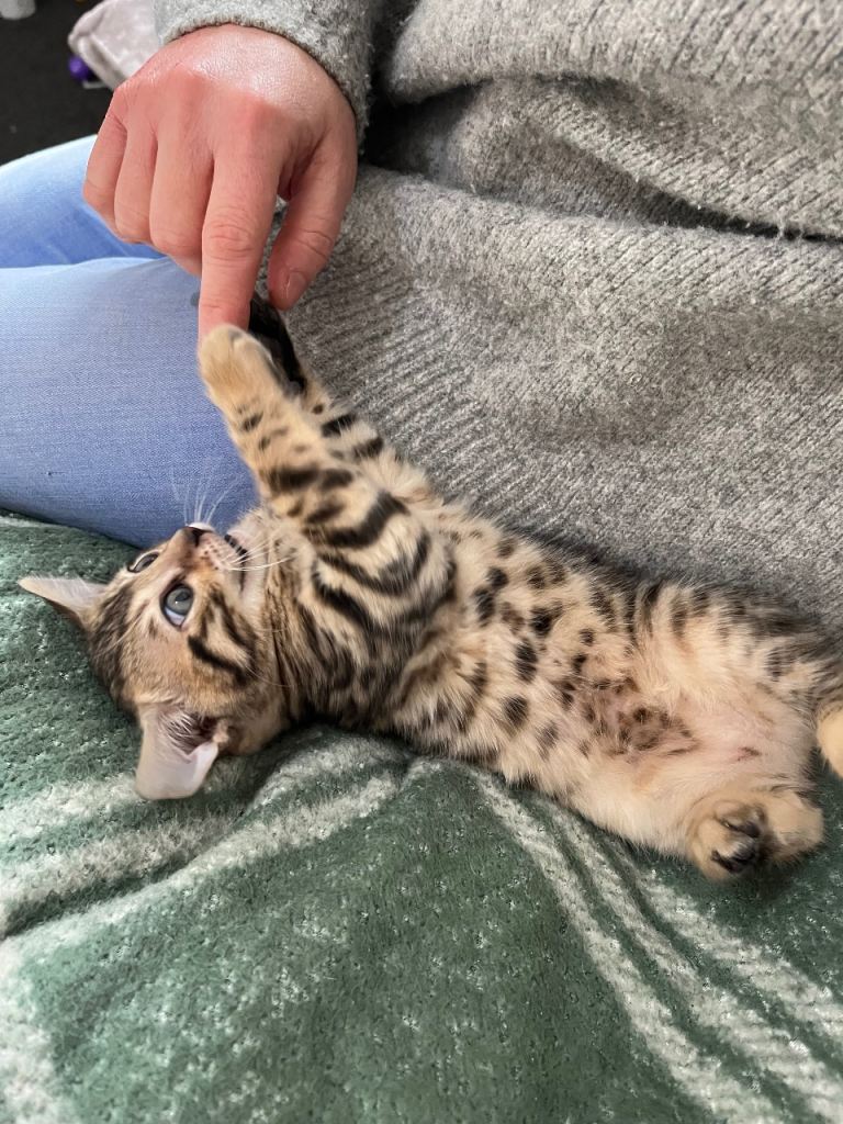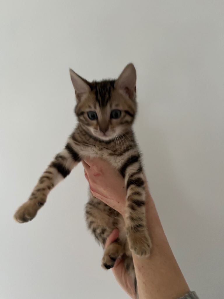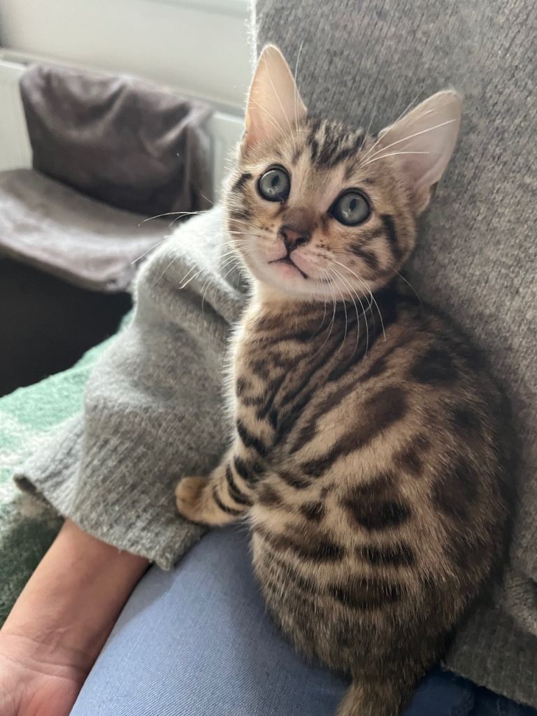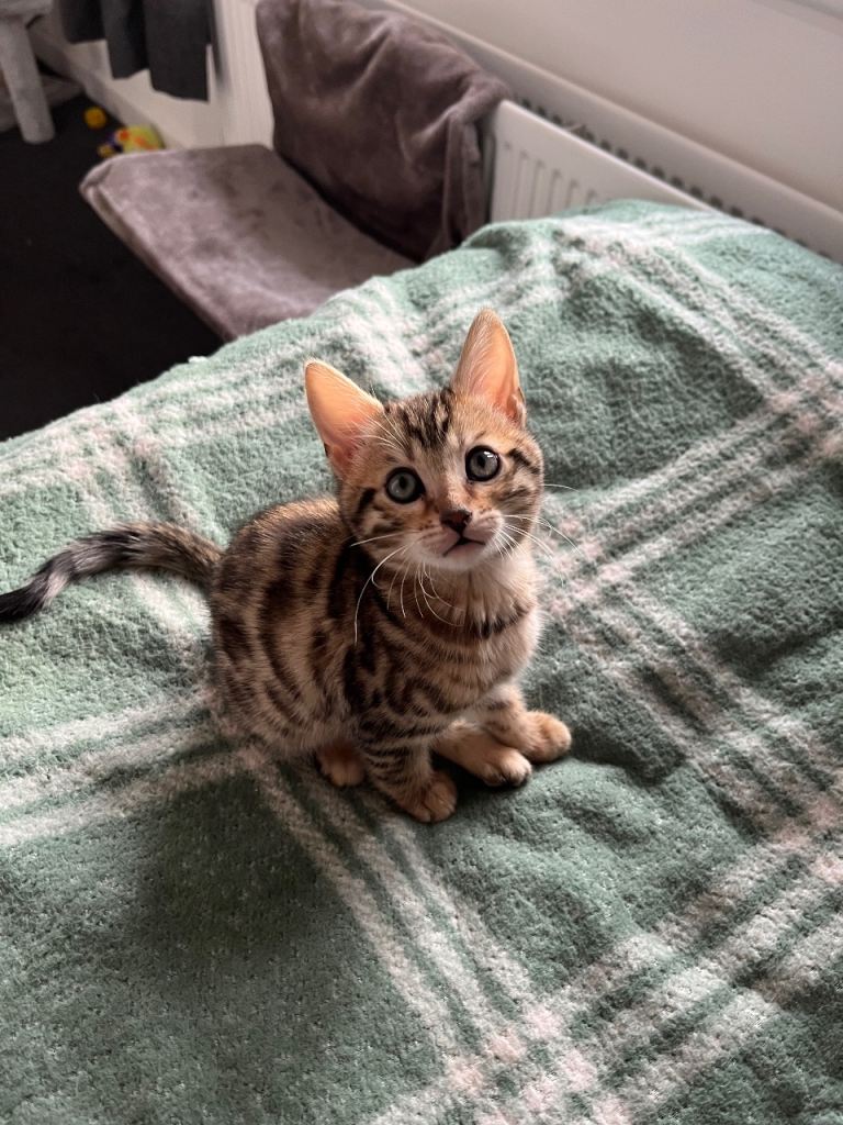 She is 8 weeks old, she is very playful and cuddly and sweet , she is using the litter tray eating wet and dry food she has been flea and wormed and vet checked she is the last of our four kittens that our mum cat had she needs a loving home. Her mum is a tabby and her dad is a full bengal she is more like her dad with gorgeous markings. She will bring lots of fun and happiness in your life