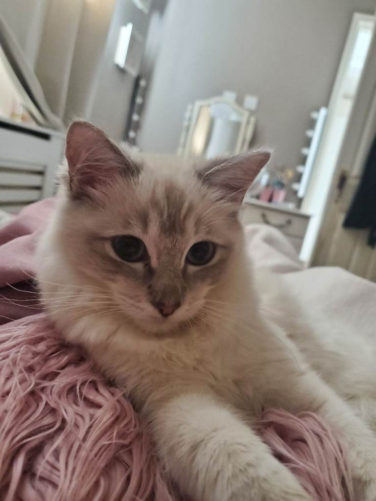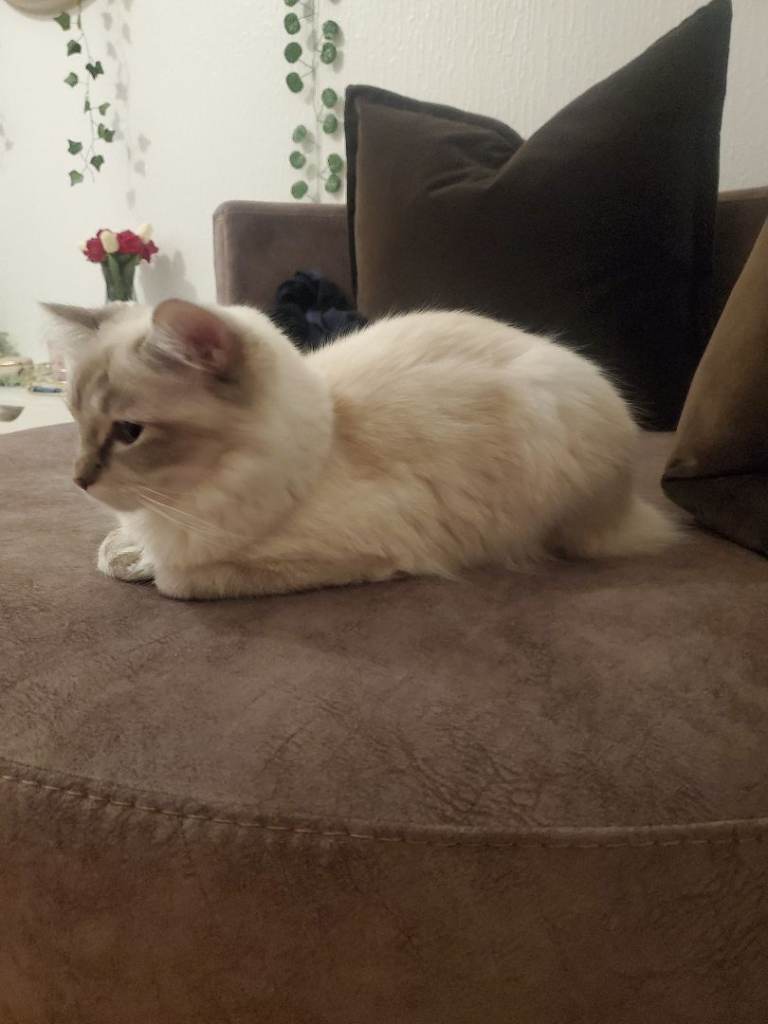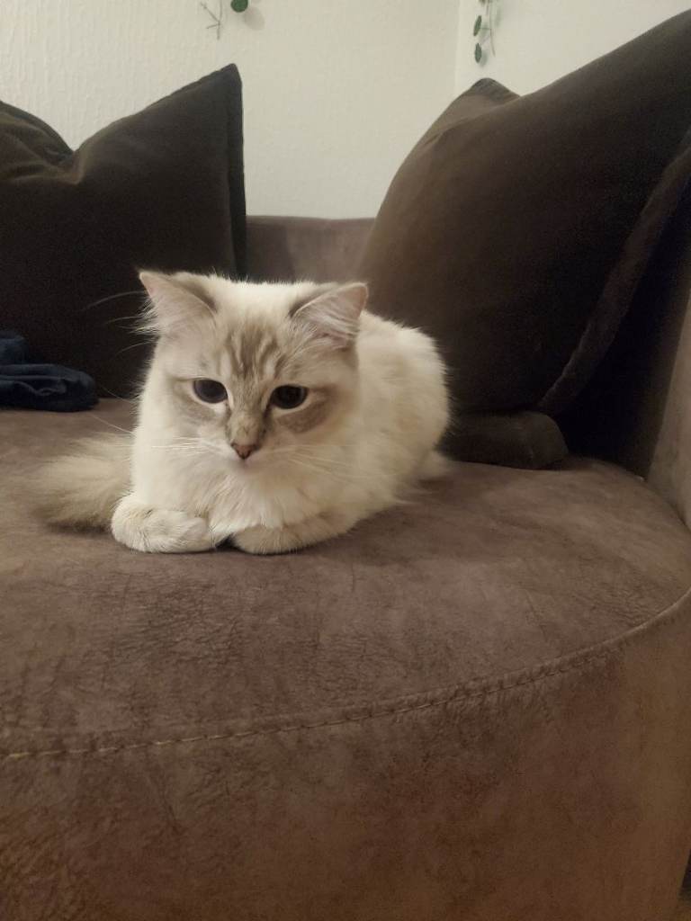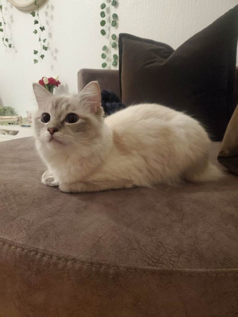 We are looking for a loving new home for our gorgeous 1-year-old female Ragdoll. She has stunning white fur and captivating blue eyes, with a calm and affectionate personality.