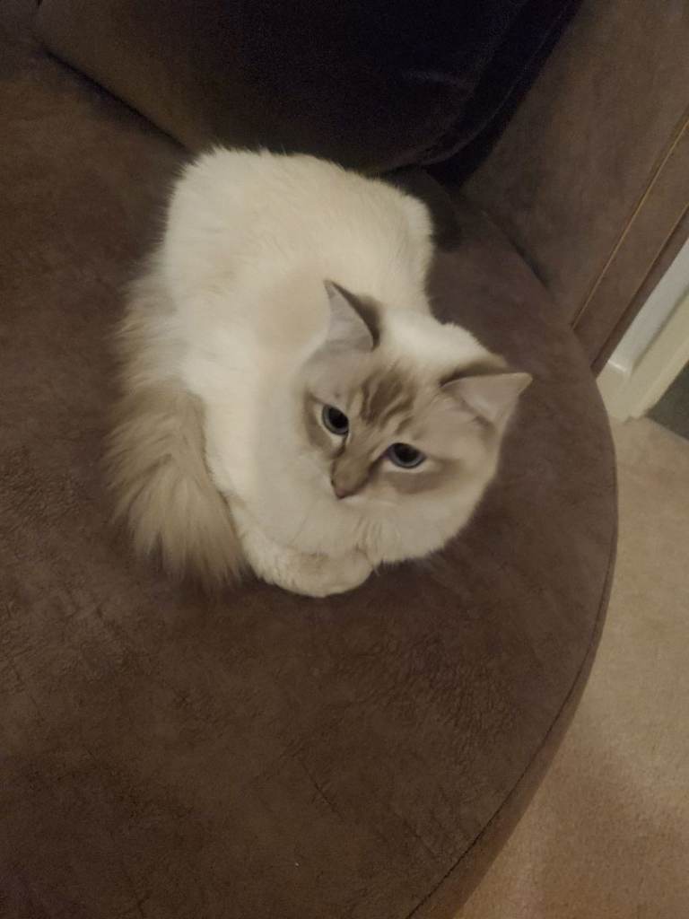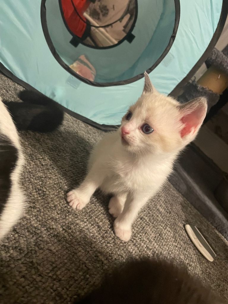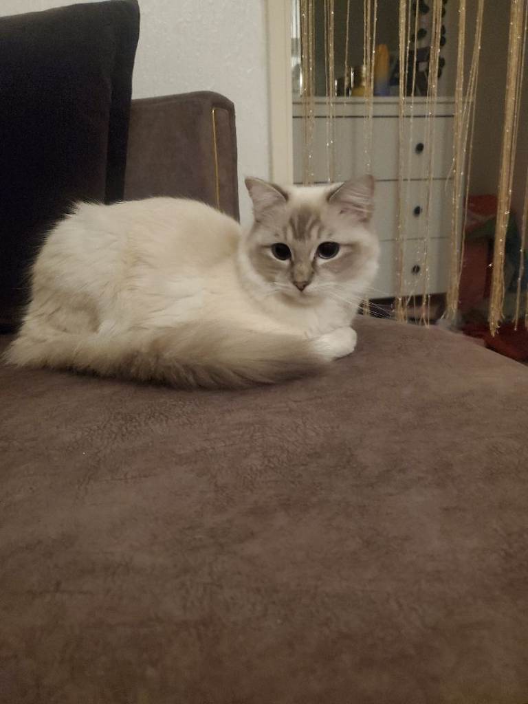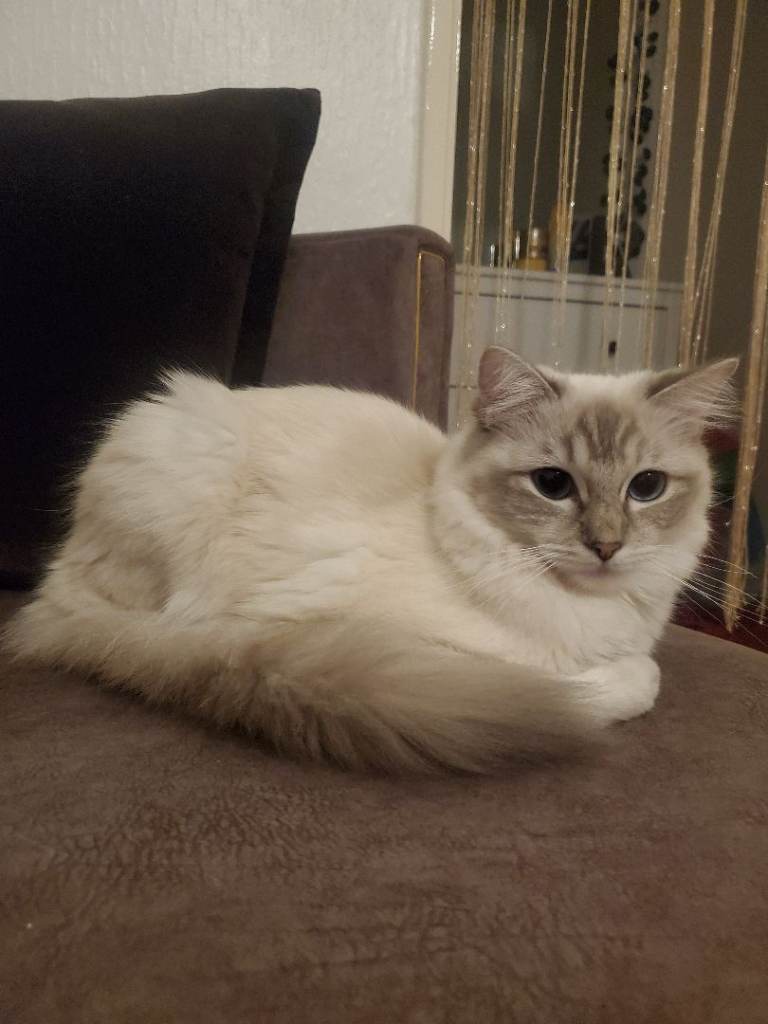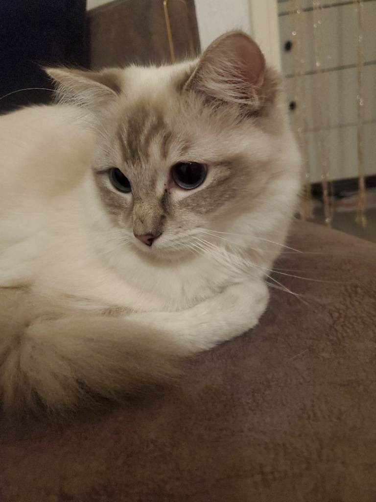 We are looking for a loving new home for our gorgeous 1-year-old female Ragdoll. She has stunning white fur and captivating blue eyes, with a calm and affectionate personality.
