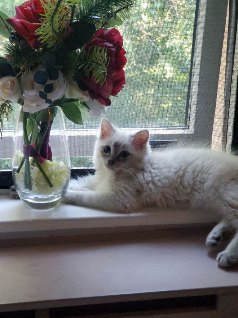 Posting for 9+ yearsBeautiful 1-year-old female Ragdoll cat with white fur and stunning blue eyes