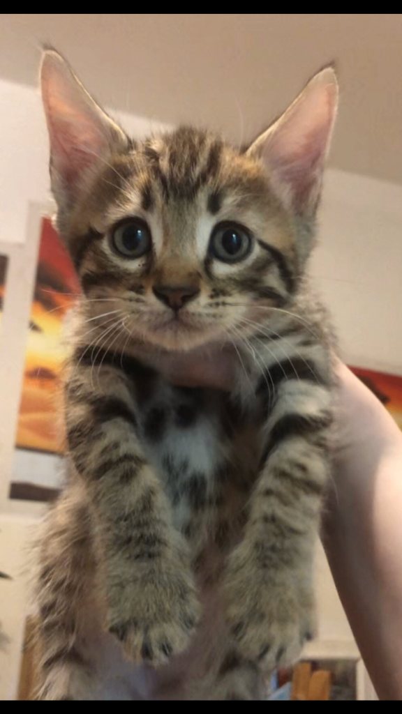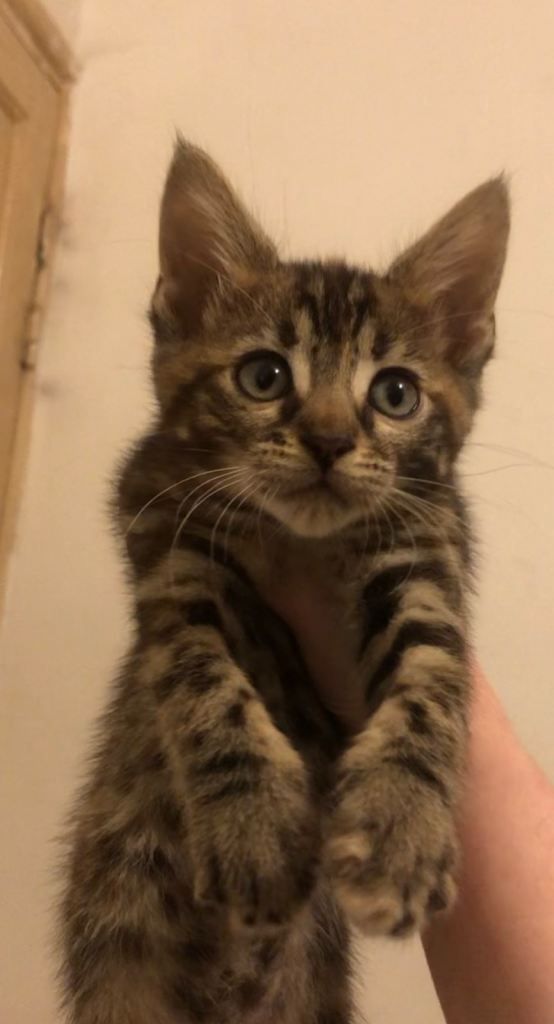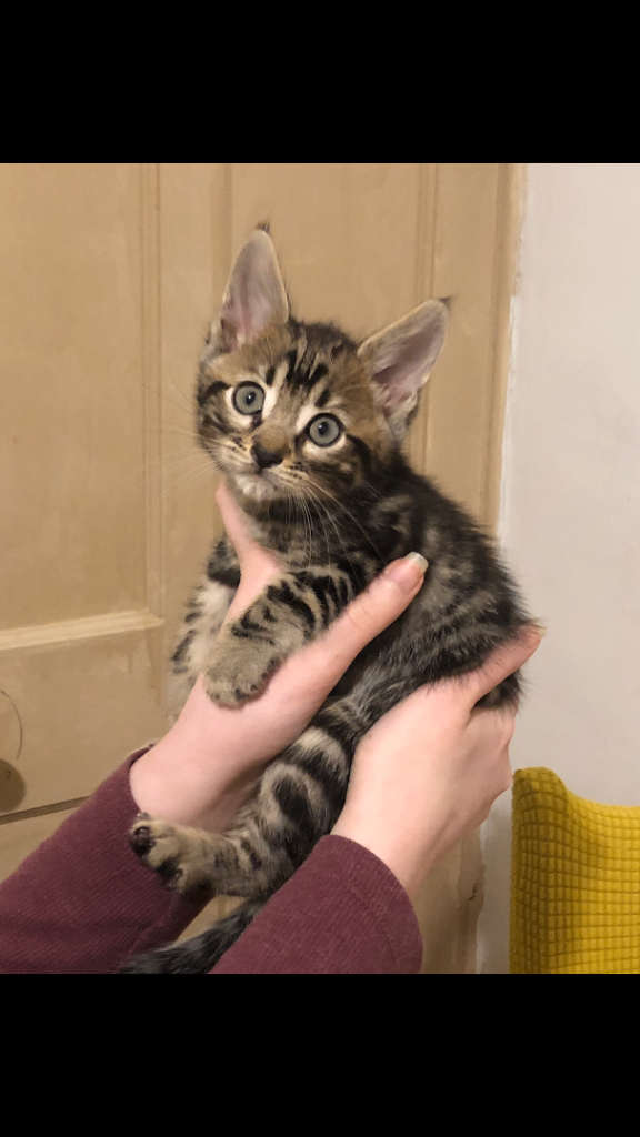 Bengal, and father is a pure Maine coon from Russian bloodlines. They all have Their wormed treatments and are eating wet and dry food by their selfs. The kittens have a very sweet personality and are very dog like, they love being held and spending time with my children. The kittens love showing affection by licking my children’s hands while being held like their father. All kittens are healthy, intelligent and chatty like their mum and very active full of energy to chase their toys and play. They are litter trained and are used to house hold noises, children, dogs and other cats.