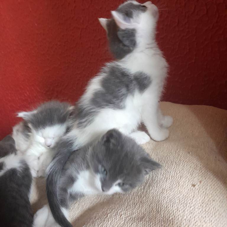 Mum is siamese cross British short hair. There are 2 mostly blue kittens they are boys. There are 3 girls, one has longer hair. They are 7 weeks at the moment, ready to go from 19th March. This mix of breed cats make really good companion cats. They are used to dogs and other cats. All healthy and playful, free from fleas, will be wormed and preventative flea treatment before homing. They are all weaning and using the litter tray.