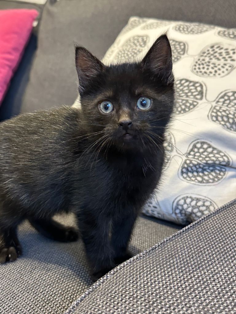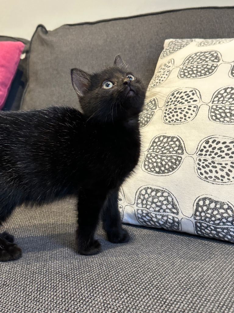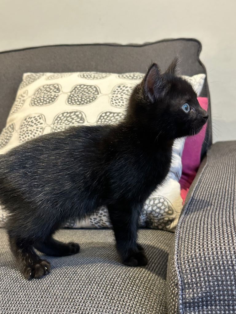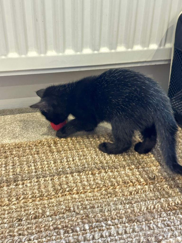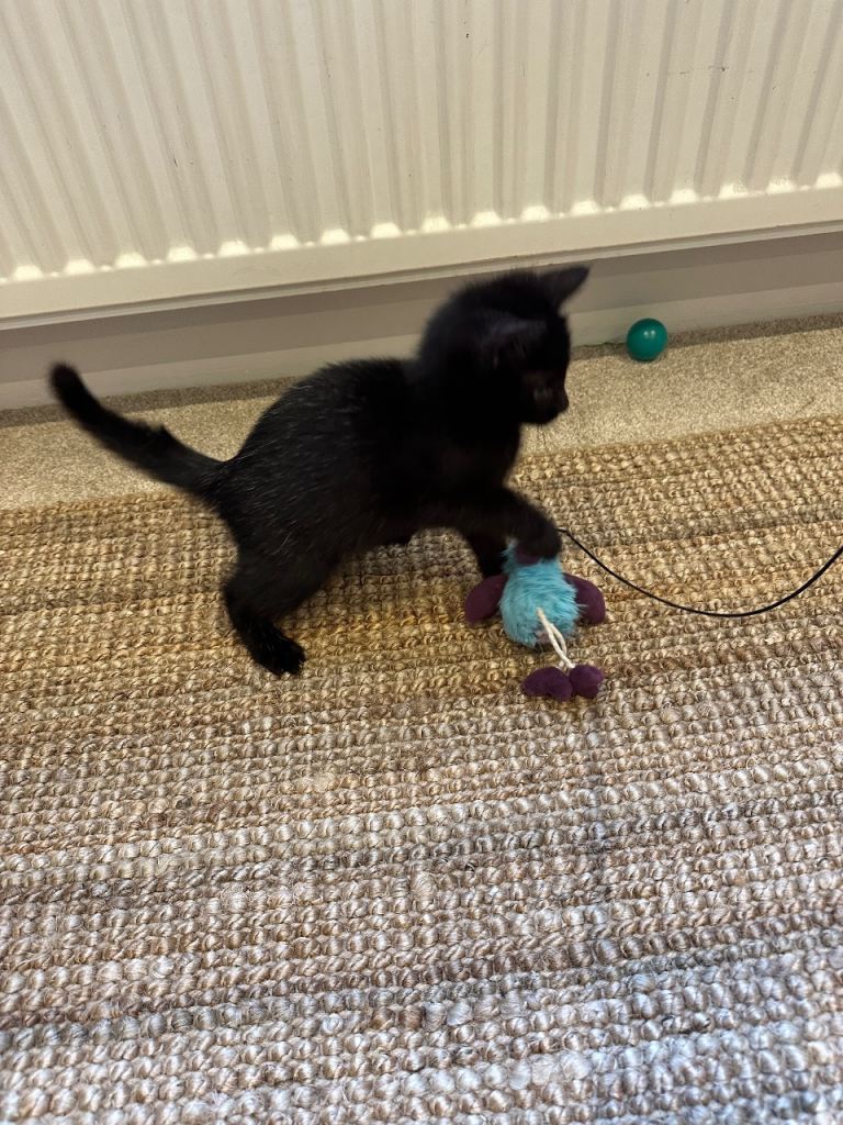 I am sadly having to pass on this adorable little boy (ten weeks old) as my older cat has not taken to sharing space with him. He is absolutely gorgeous, black with some silver/white tips in his hair. He would make the most wonderful addition to any home. He was raised with children and dogs so is used to family households. He loves to play, chasing toys, and is happy to cuddle and be held. I don’t want money for him, just a happy and stable home. please message if you have any questions. Recently deflead/wormed and using litter tray, eating wet food.