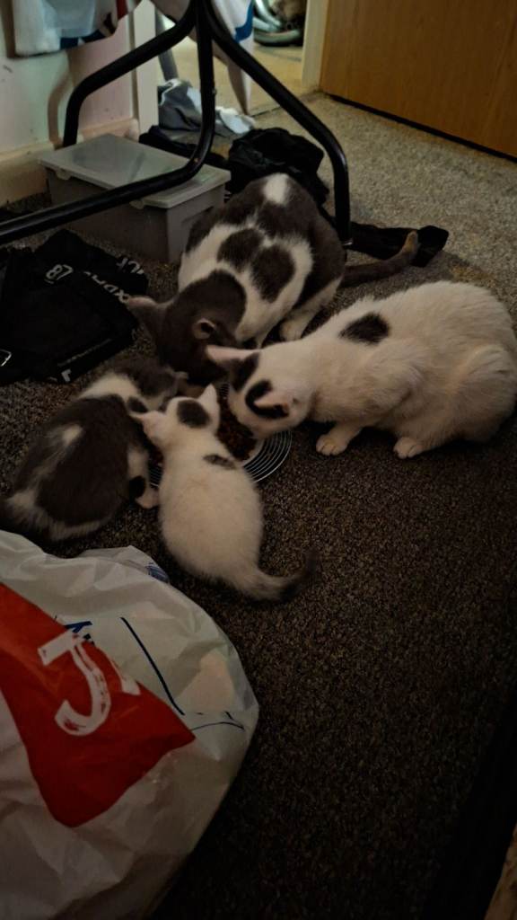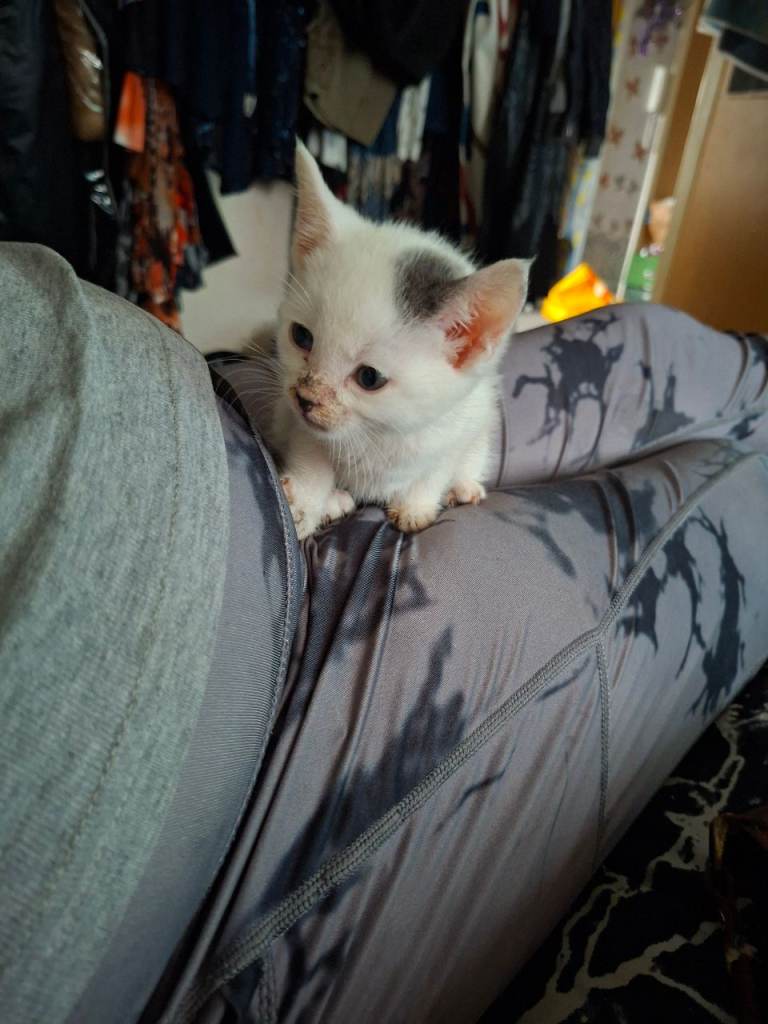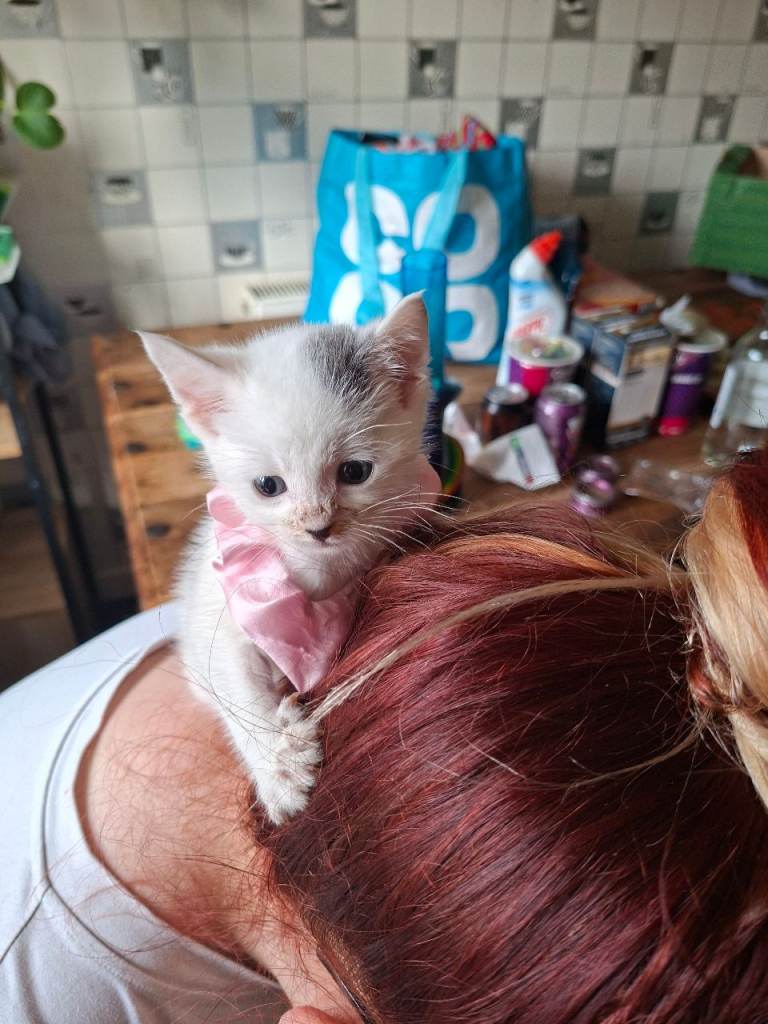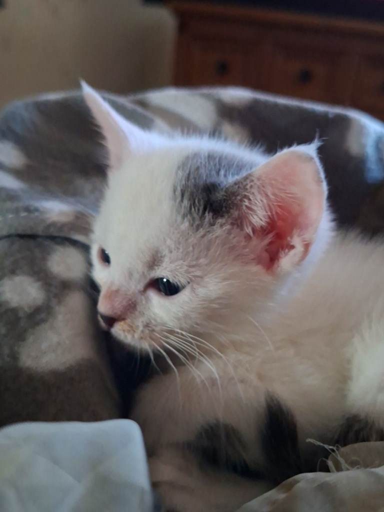 Stunning white and grey spotted half chartreux, half british short hair. With a possible siamese connection. Tame, litter tray trained, de -flea'd and de wormed
