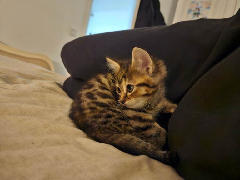 We have a beautiful healthy kitten looking for her forever home. She has been raised in a loving home environment and is well-socialised, confident, and used to everyday household noises. We are specifically looking for homes where they will have safe outdoor space once when they are old enough to enjoy it.