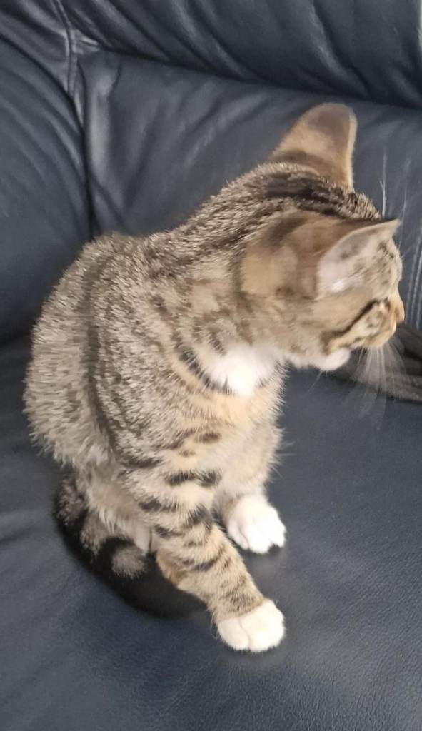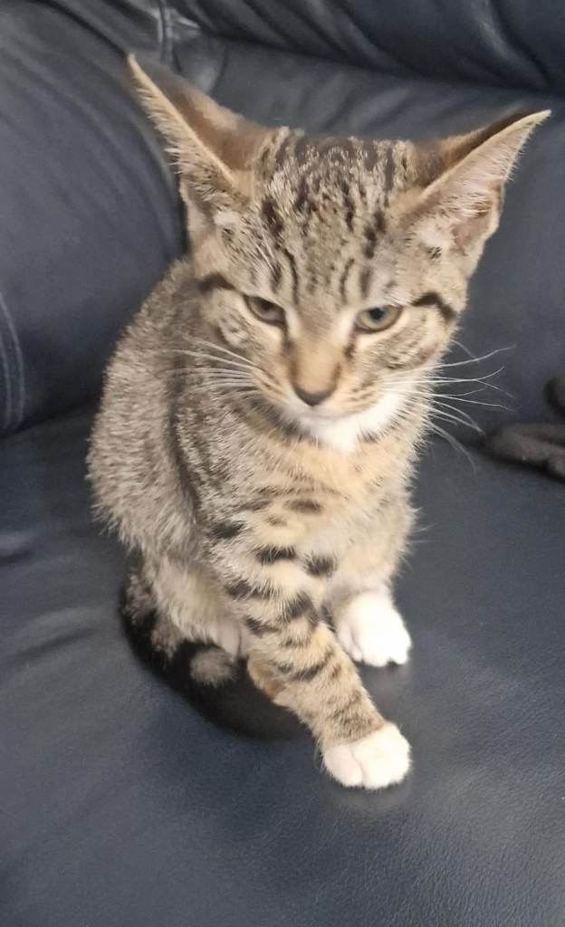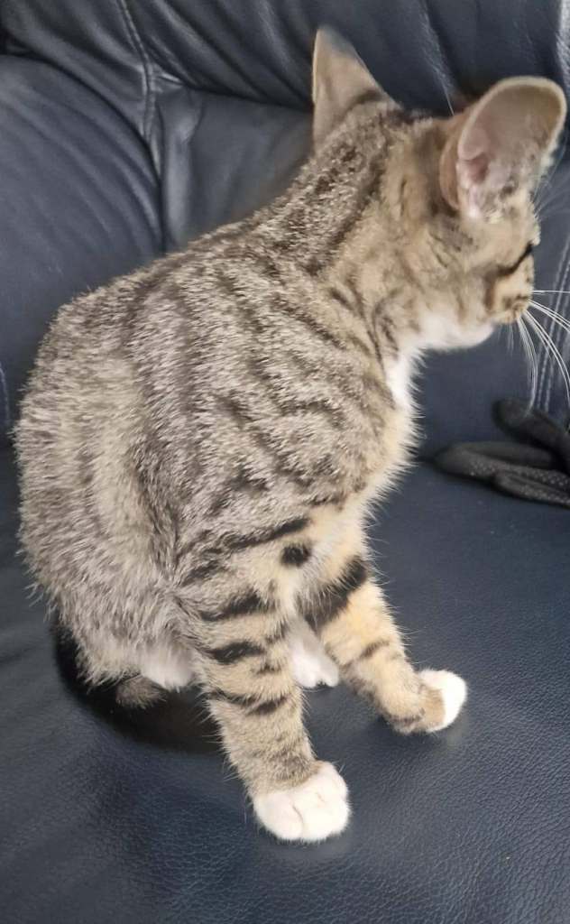 Female British shorthair tabby kitten now 6months selling for £125. Their are lot of extras with her like cat tree, tray, scoop, food tray, pet carrier and toys etc.