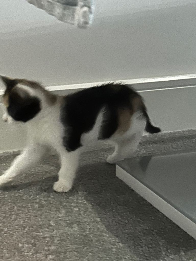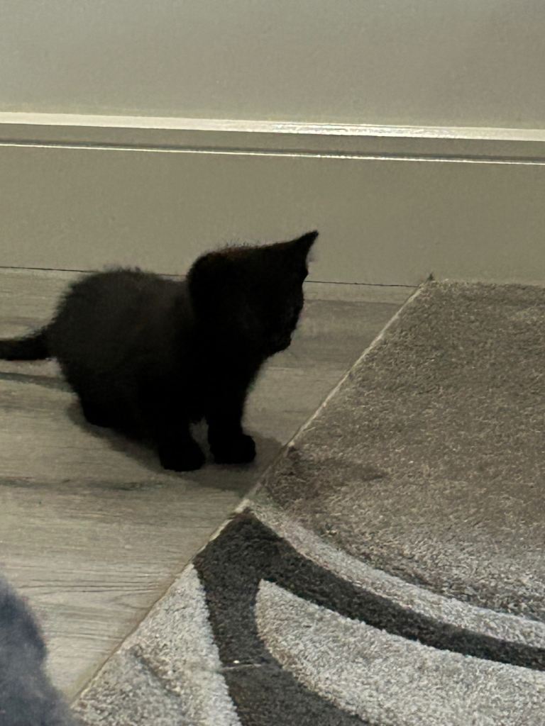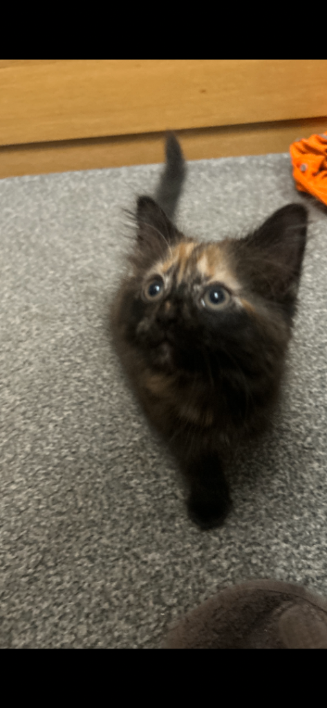 Three beautiful kittens for sale, 8 weeks old, 1 boy black, 2 females, litter tray trained, wormed to date, eating wet and dry food, love their treats. Brought up in family home with other pets..