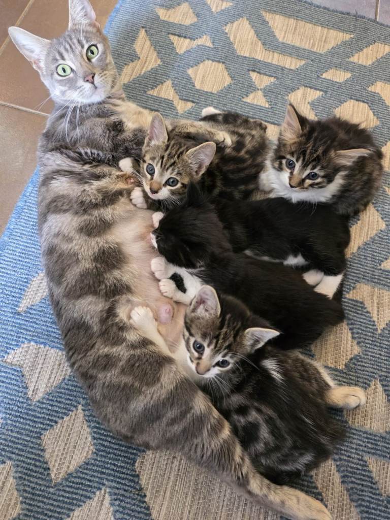 Our blue bengal has had a litter of kittens. They are not full bengal kittens. We have a mix of boys and girls, long and short hair, tabbies, black and white.