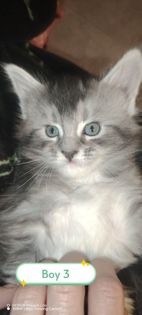 We have Beautiful 1 girl and 2 boys kittens for sell . We had 5 kittens, but two of them have already found their homes. The kittens are very friendly and affectionate. From the very first day of their lives, they have been surrounded by care and love. Both parents are TICA registered and 5-generation pedigree certified. Mum is Blue Classic Tabby/White, Dad is Black silver Ticked Tabby. Ready to leave now. You can come and see that lovely kittens. Happy to help with anything you need to know. If you like to see more pictures I'm happy to send them or you can come and see them.