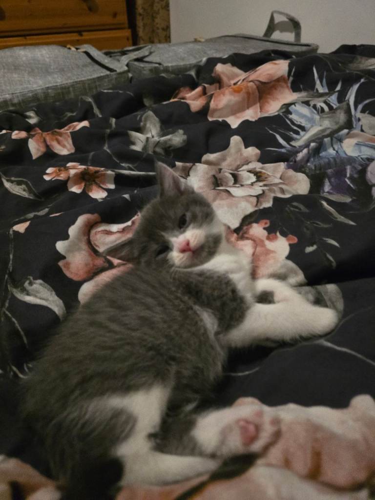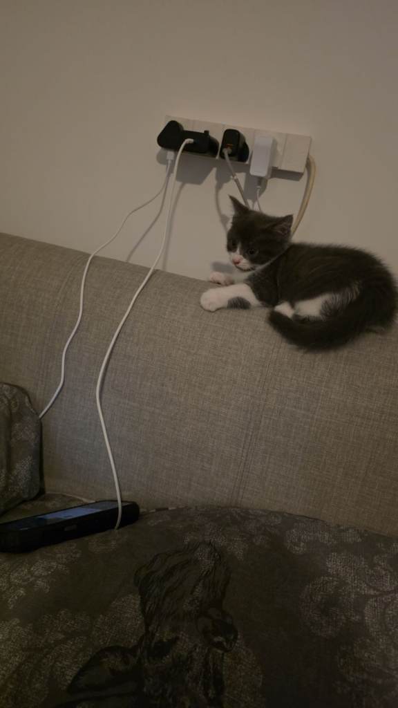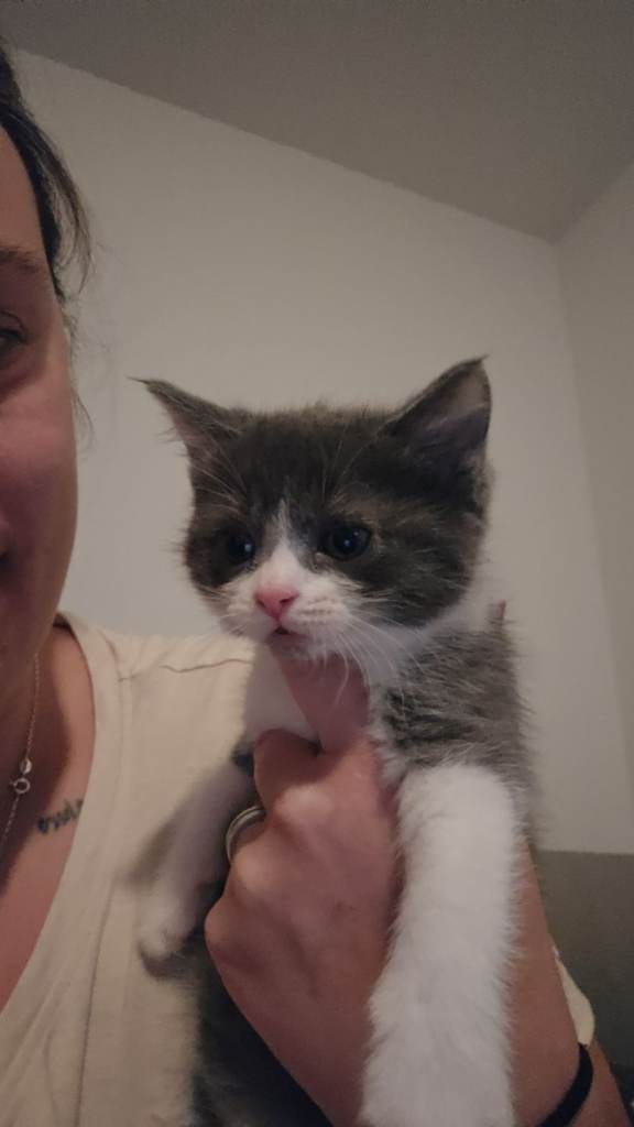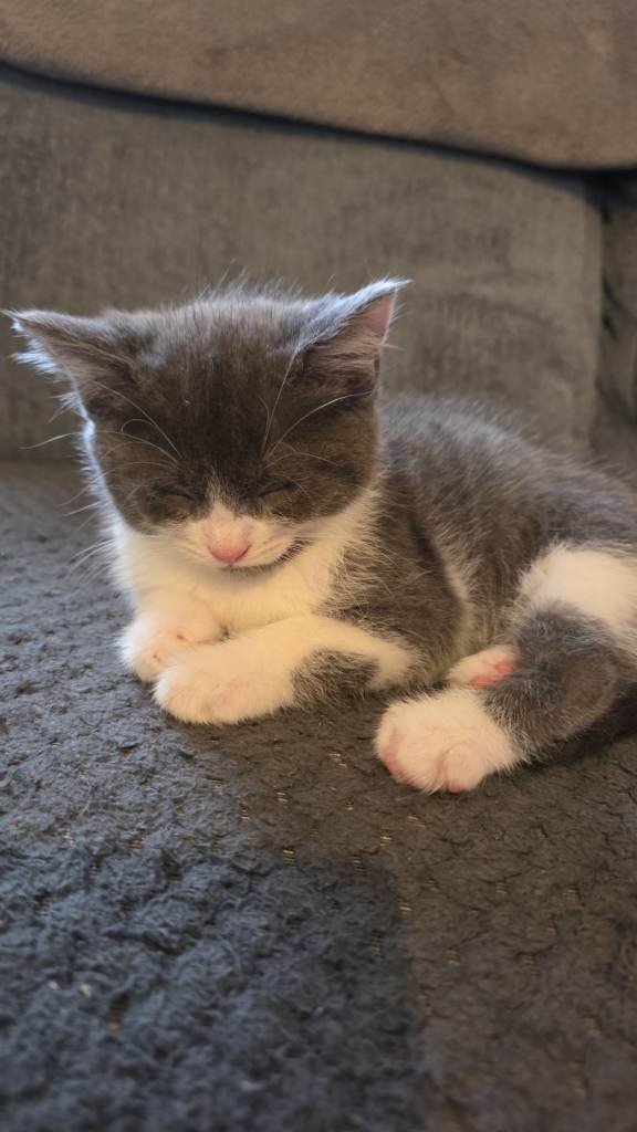 Beautiful Grey with white tabby girl.. ready to go. Back up to be rehomed due to circumstances..