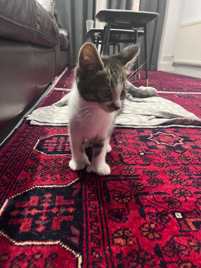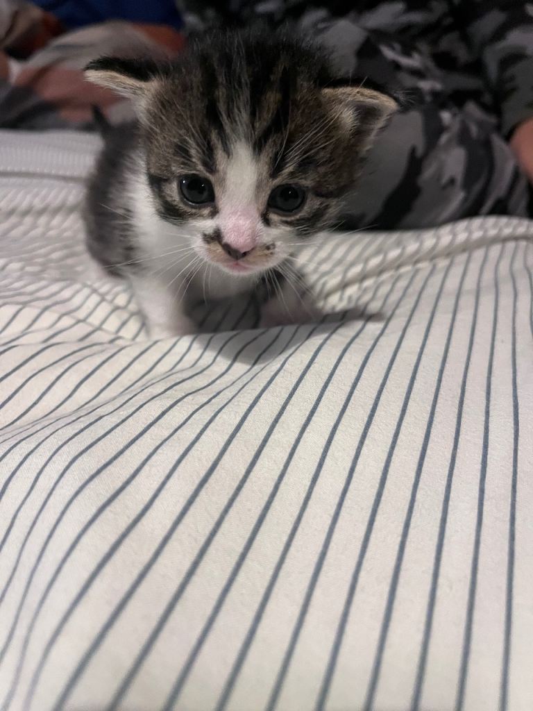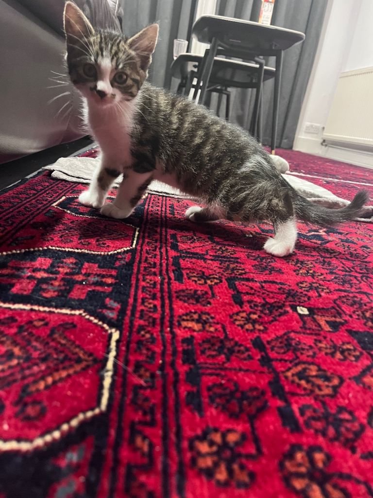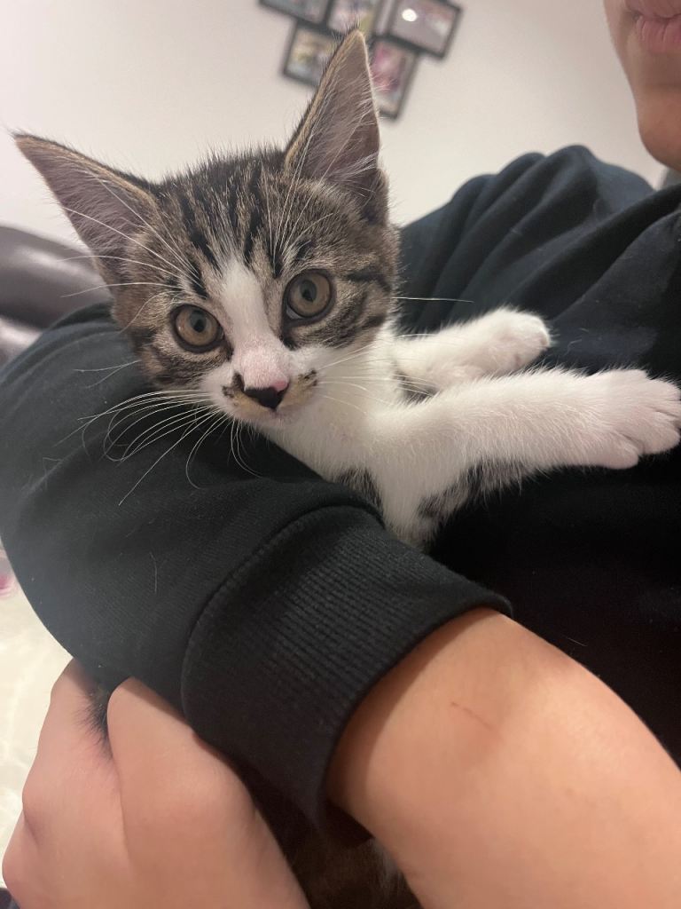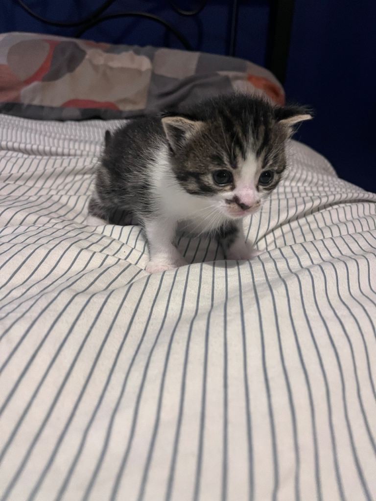 Beautiful tiger print Turkish angora female kitten 8 weeks old and ready for a forever home. Very sweet and loves cuddles. Very friendly around children. Grey and white colour.