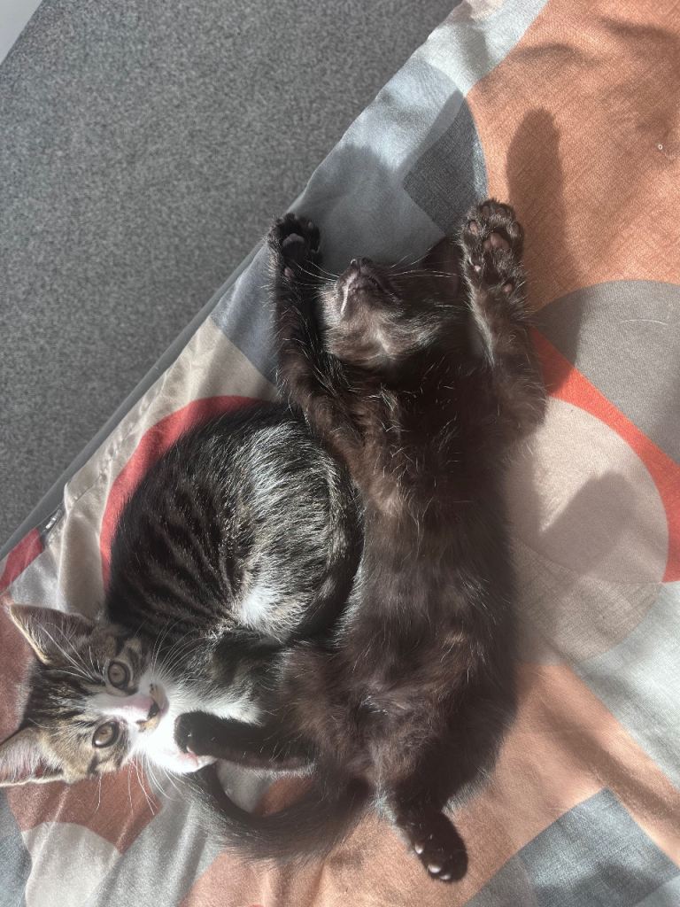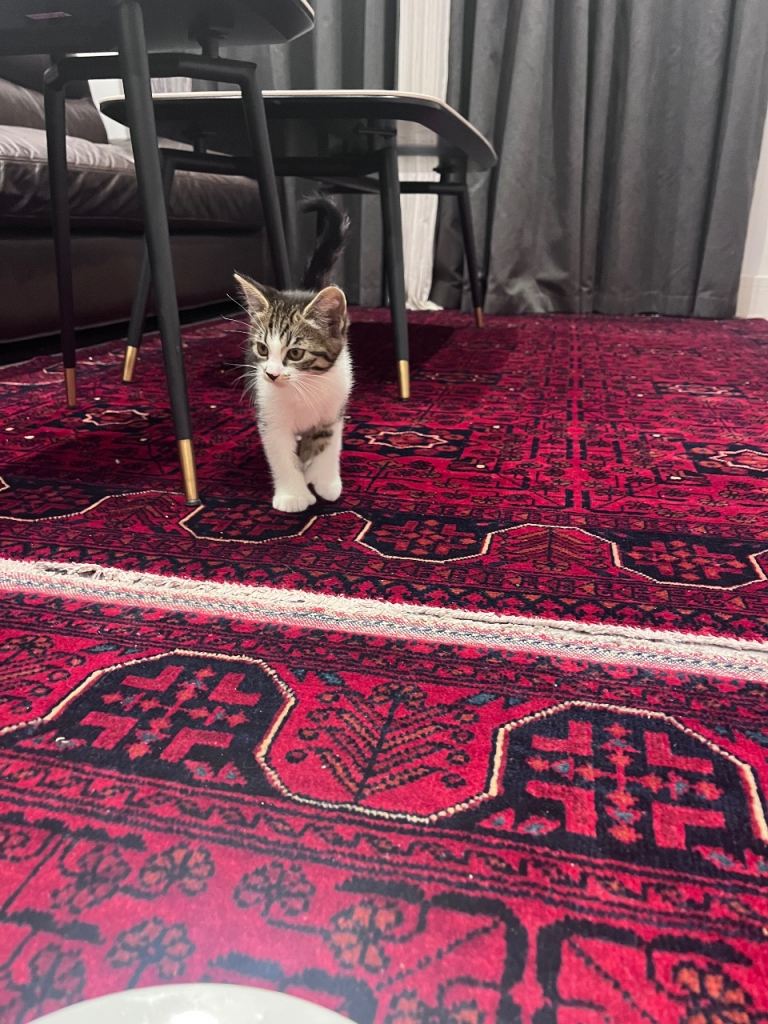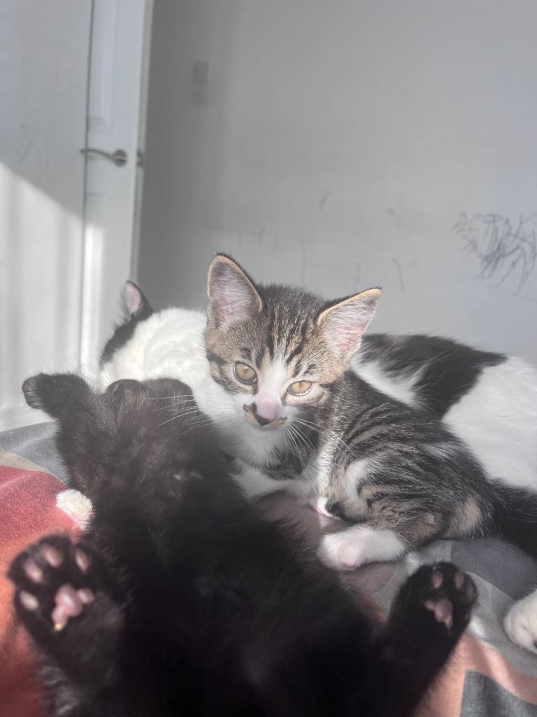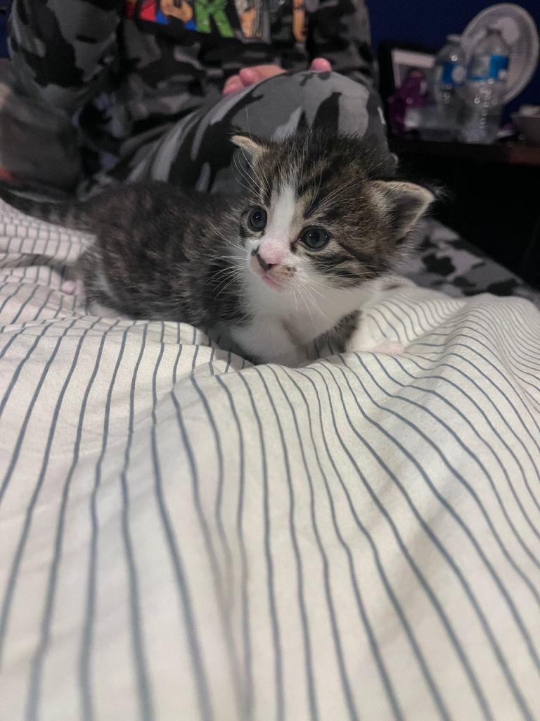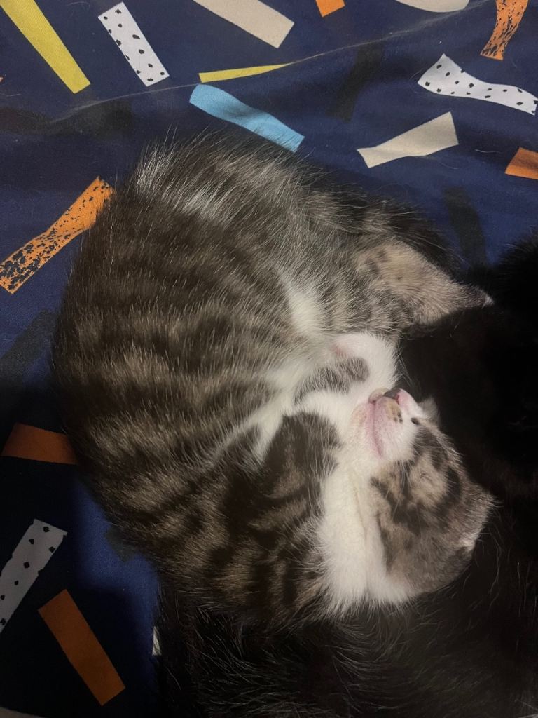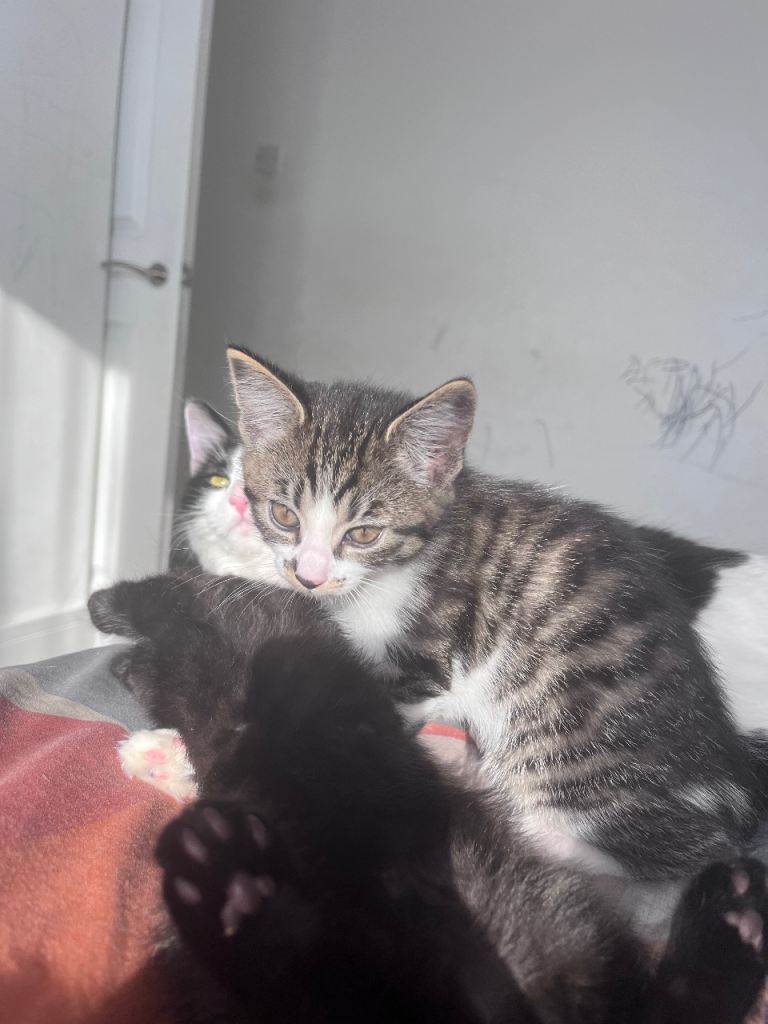 Beautiful tiger print Turkish angora female kitten 8 weeks old and ready for a forever home. Very sweet and loves cuddles. Very friendly around children. Grey and white colour.