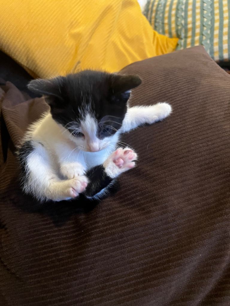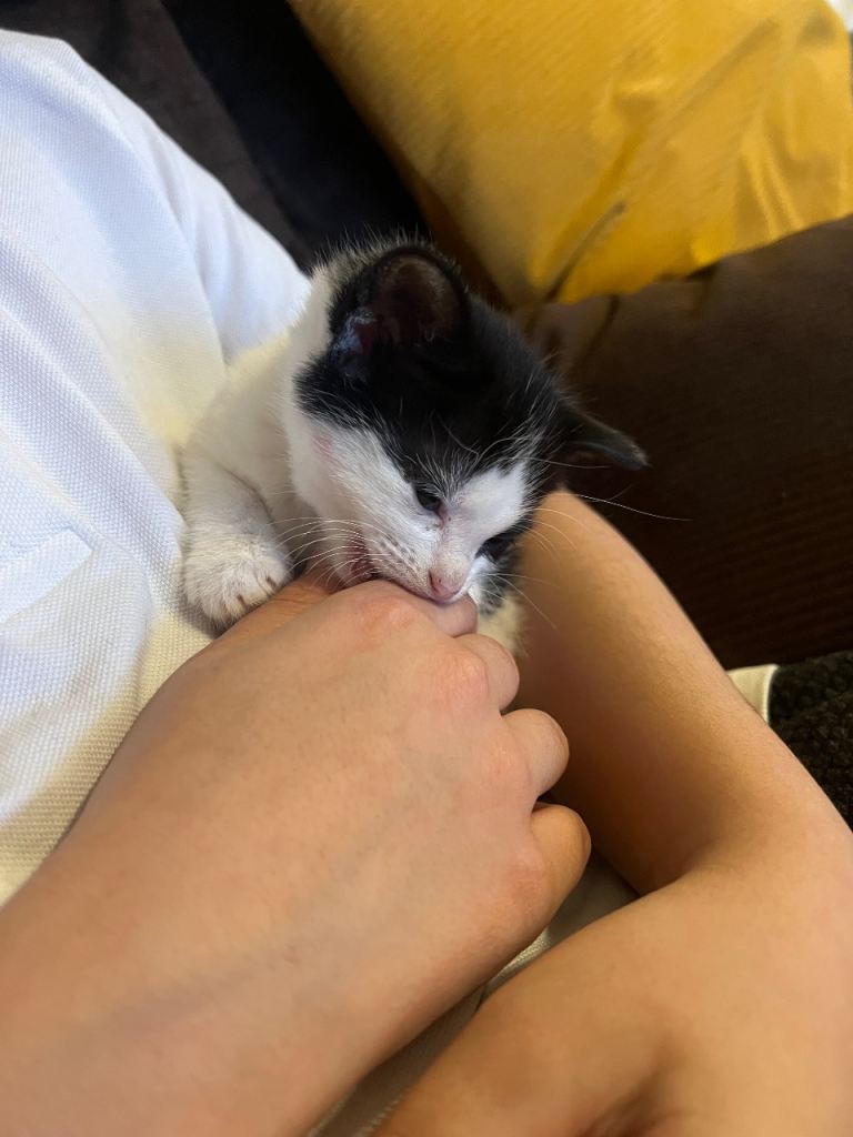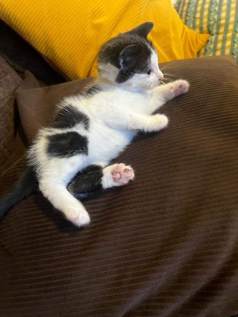 She is an adorable, littered trained and eating solid/wet food on its own. Looks very small. I bought this few days ago for my 20 weeks old kitten to company as his brother died last week but they are not getting along, so we need a beautiful house who can take her responsibility and treat her like princes as you cant ignore her meow and cuddles, she just want hugs and lot of hugs.