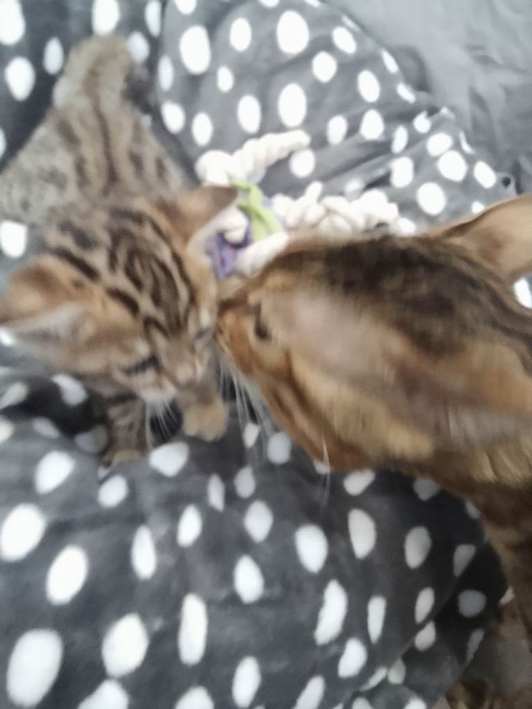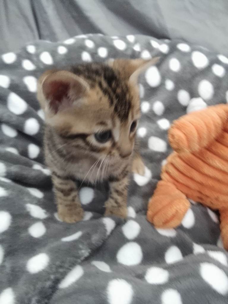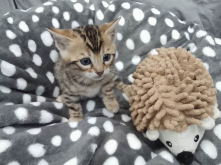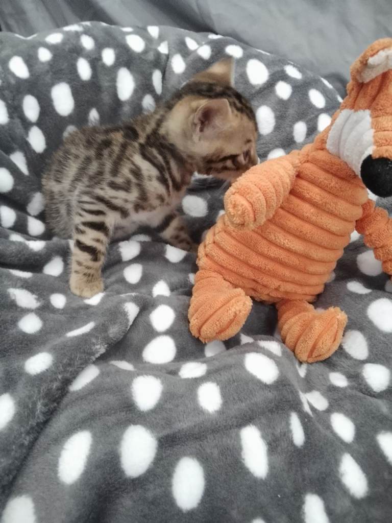 We have two beautiful boys and one adorable girl left available. The little girl is the kitten with the purple shoe toy and the boys are the two kittens pictured with the fox and hedgehog play teddy. Please consider getting in touch if you are serious about having one of these babies for life as we want the perfect homes for them.