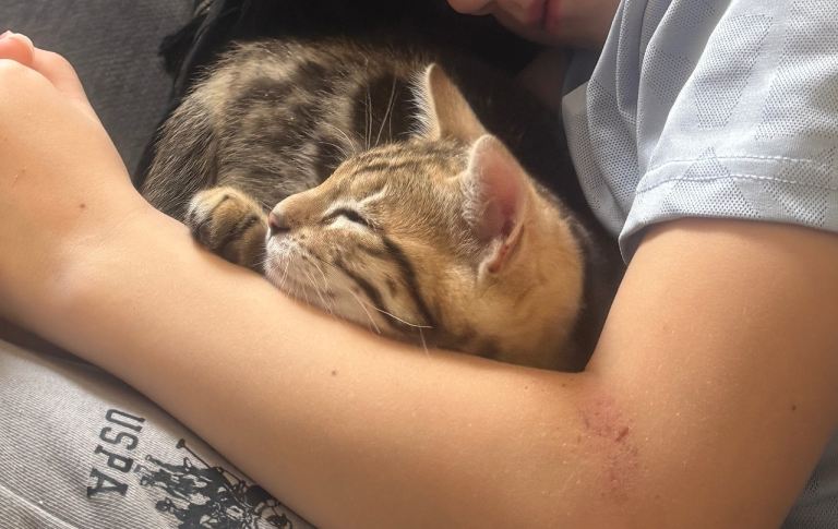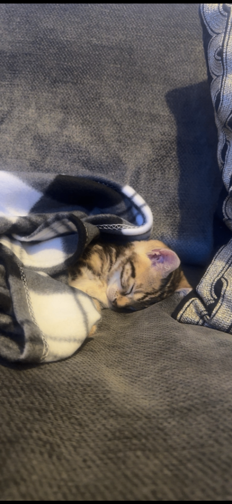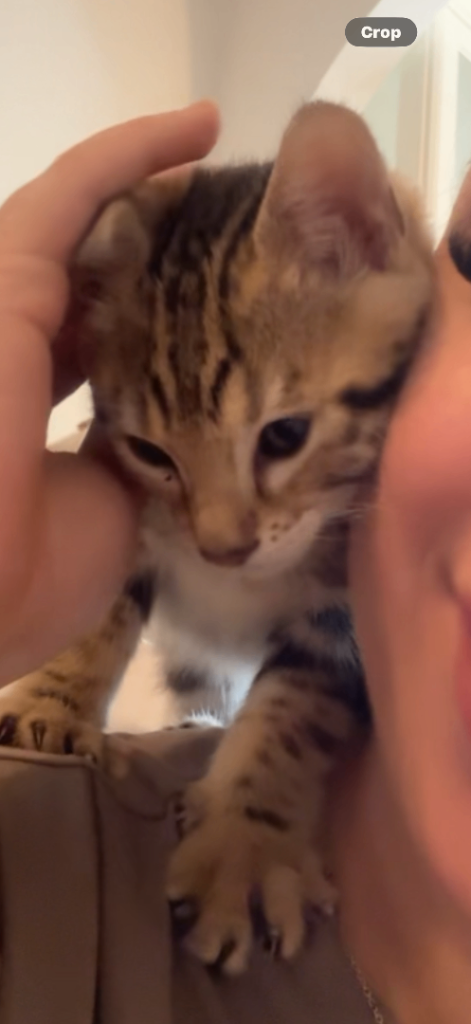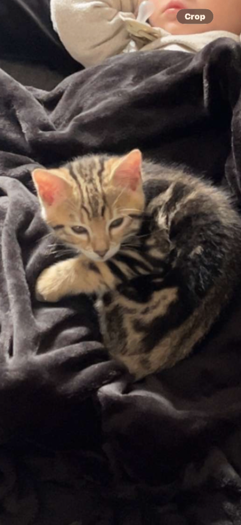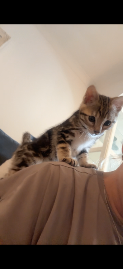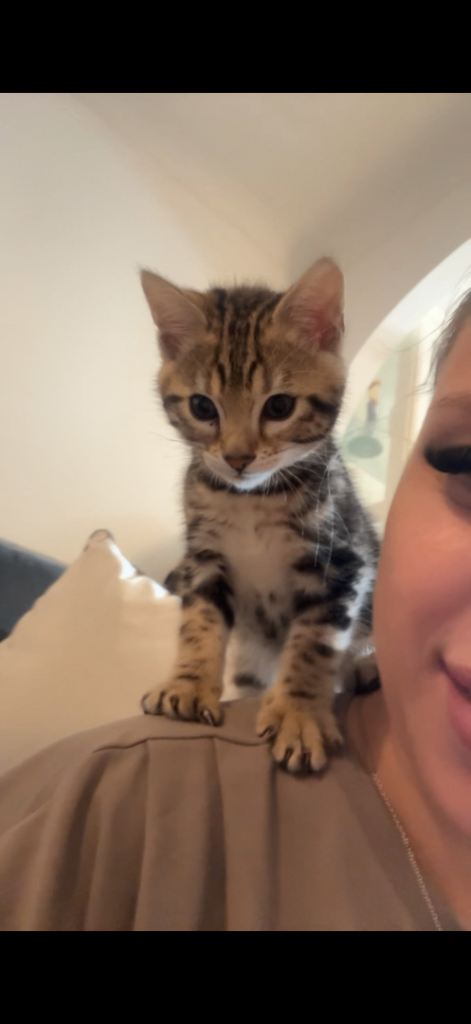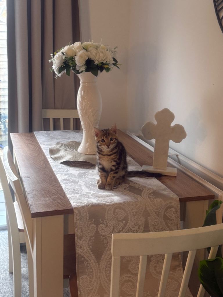 We got him at 8weeks but unfortunately we have been told we can’t keep him. He is really friendly fine with children (he’s very much used to my 1 year old pulling him about) 🤣 he is litter trained & comes with all toys, cat bed, cat tree, cat box litter tray and all food and litter we have left over. I’m so heartbroken to have to get rid of him he is a beautiful super cuddly kitten. Open to offers 🫶🏻
