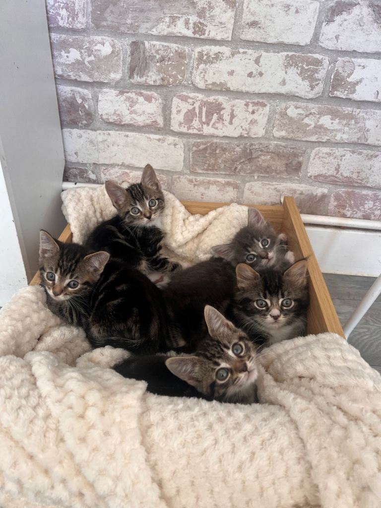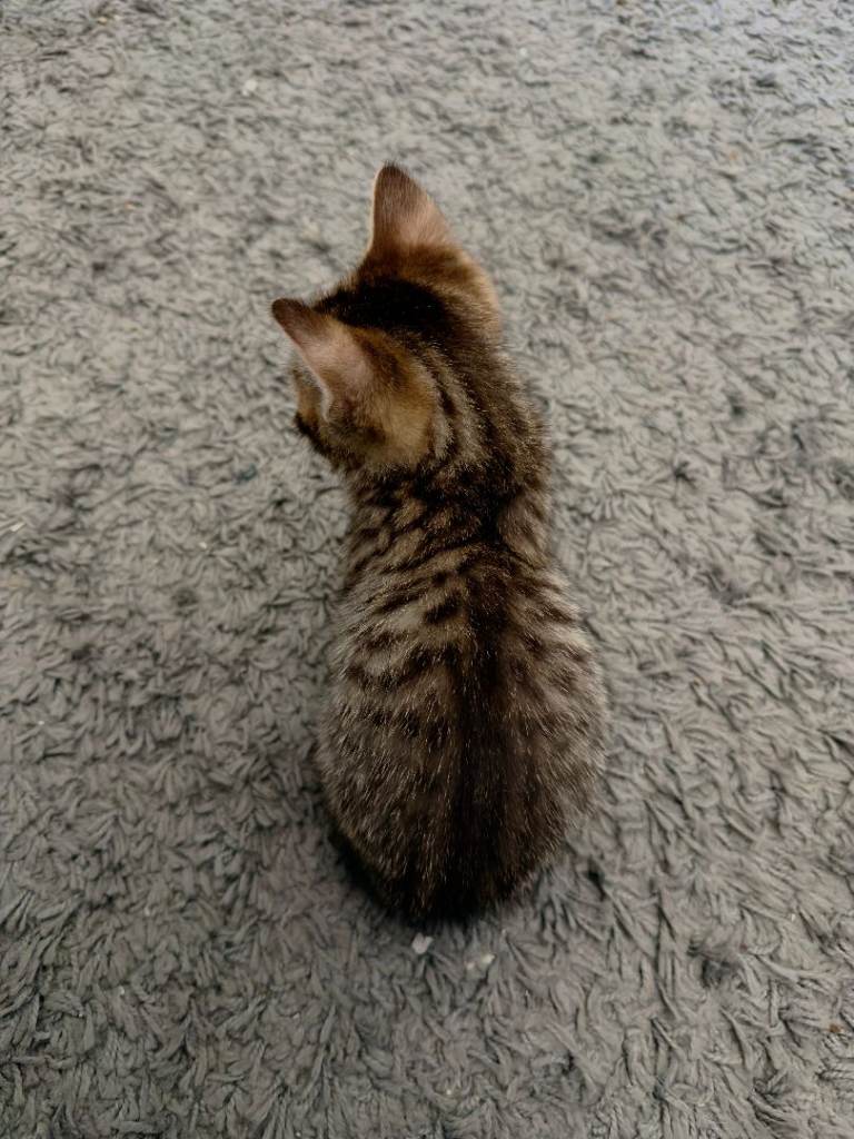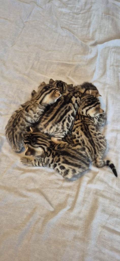 We are sadly rehoming our extremely cute Bengal babies.they are extremely friendly and purr constantly when around their favourite humans, they have been socialised as they ve always been around kids and other pets. They are extremely active and love to play way too much, so much that they forget to sleep at times. They have been eating solid and wet food from many weeks and extremely well litter trained. They re used to daily household noises and are very friendly. They are obsessed with cuddles and will fall asleep whilst being cuddled. Do not bite or scratch. Had their vet checks, been deflead and dewormed. Can show what I have used. On “Sheba”kittens wet food, “breeder’s choice “ litter and purina kitten dry food.