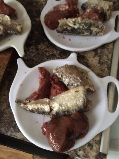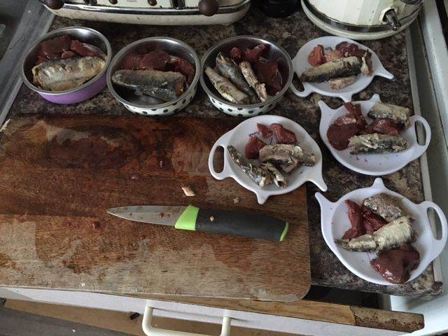 Raw/scrambled egg. Lambs liver raw, Ox liver raw, tuna in spring water (drained) Raw cod, Cooked Cod, Mackrel in brine (drained) Sardines in brine (drained) Beef mince raw, Ox kidney raw, tuna & raw egg.