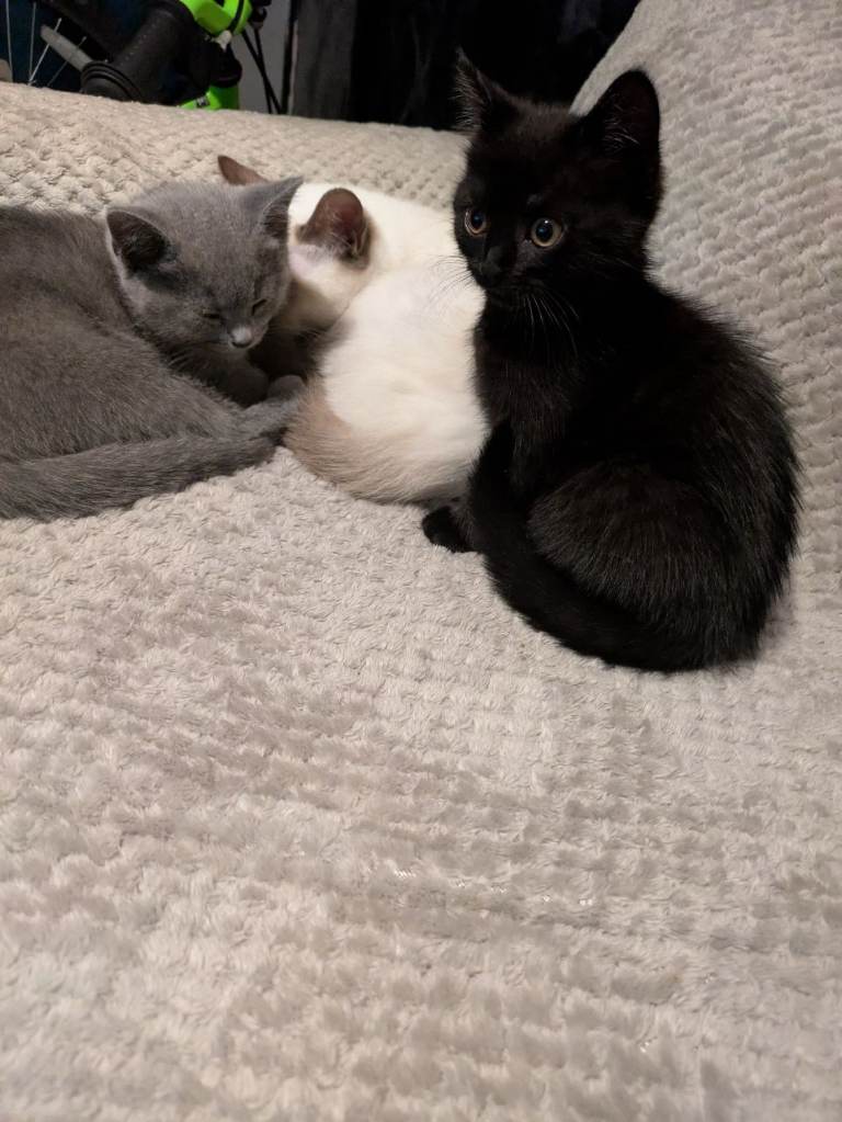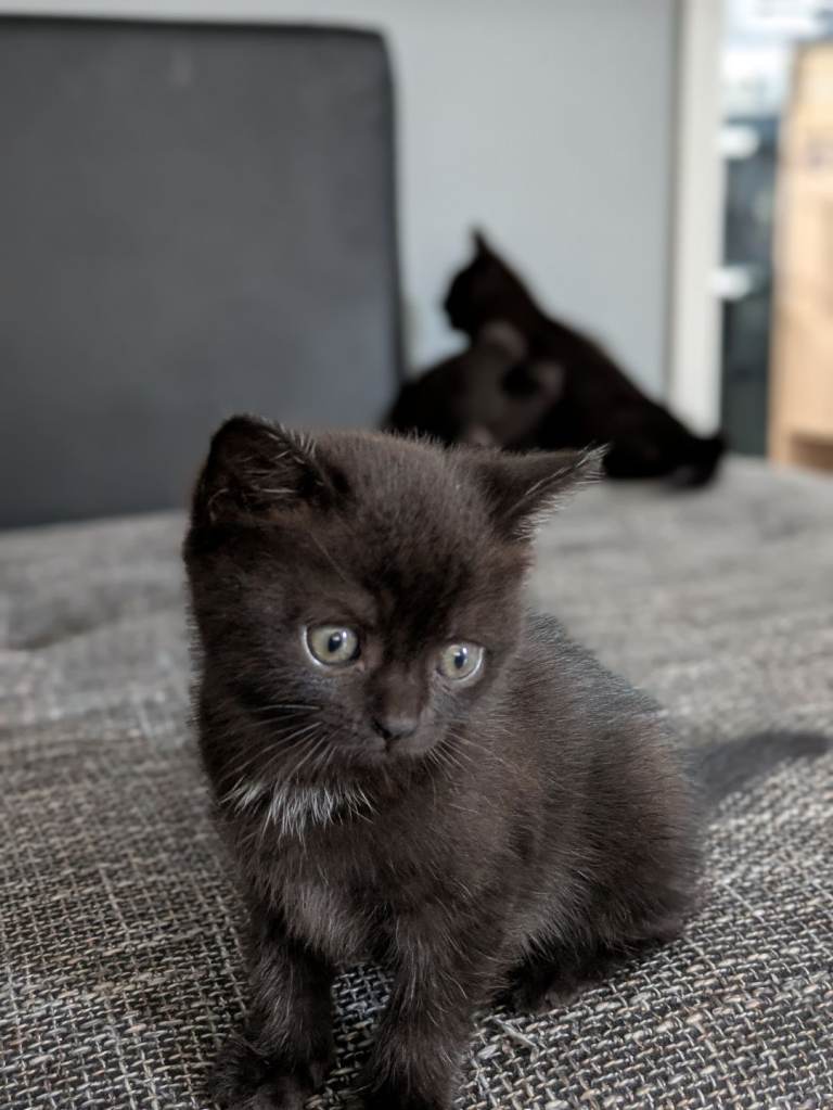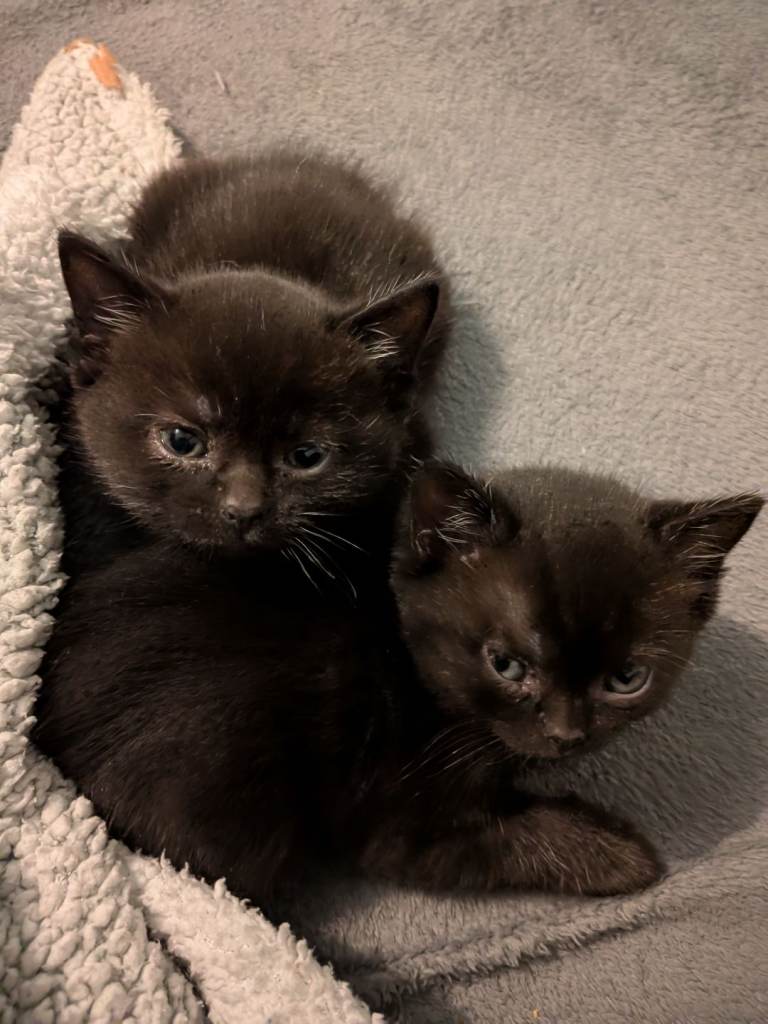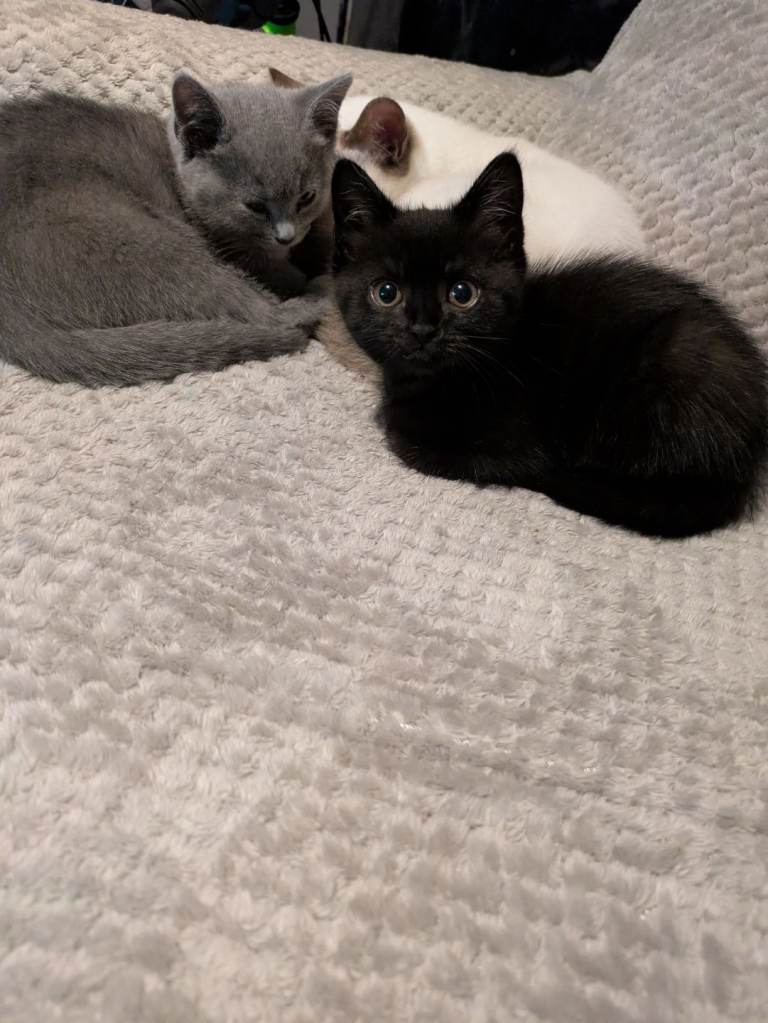4 Bsh kittens looking for a loving home . Very friendly, playful ,good with kids ,2 boys and 2 girls .