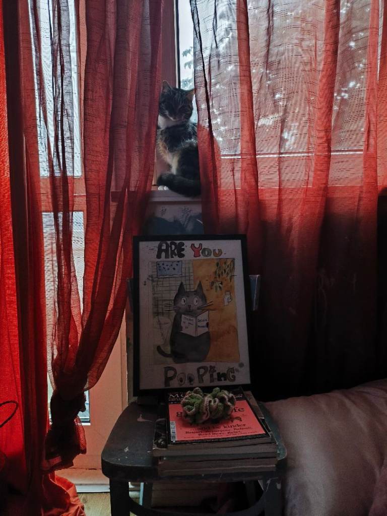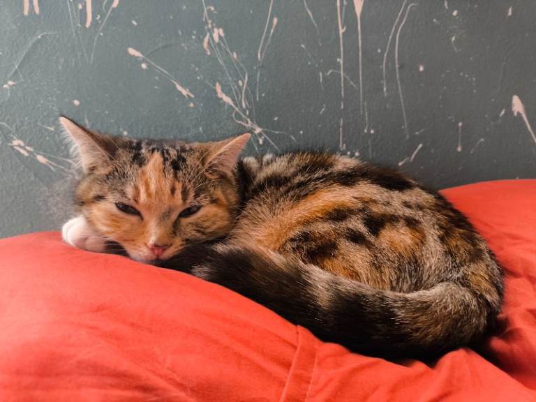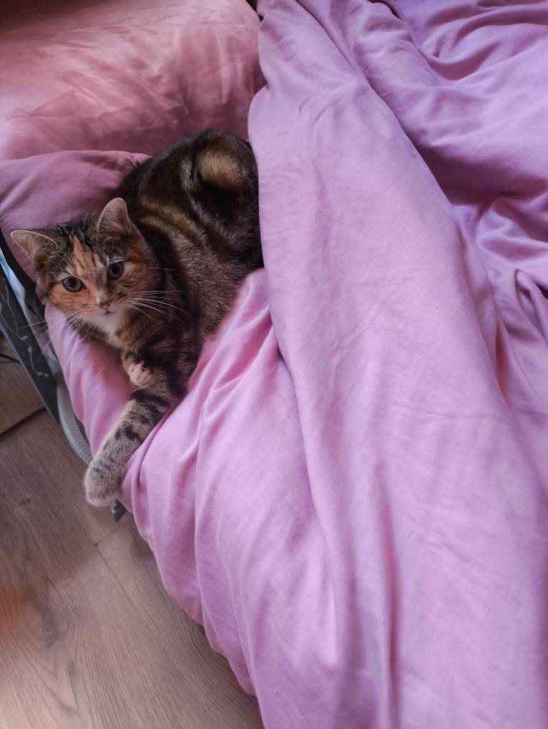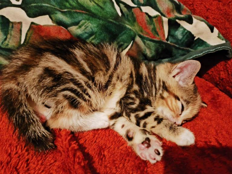 Remi (Daughter, 1 yr, blond and dark brown stripes which earned her the nickname sandy/blondy): A playful and curious kitten who is a total "velcro cat"—if you're sitting down/or in bed, she’s likely cuddling in your lap! Or sleep on your chest.
