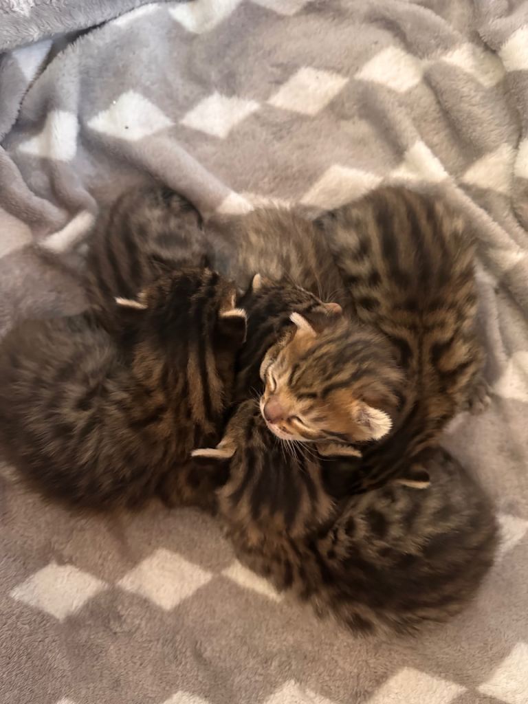 We have a lovely litter of Bengal mix kittens looking for their forever homes. They were born on 26 February and will be ready to leave when they reach 8–10 weeks of age.