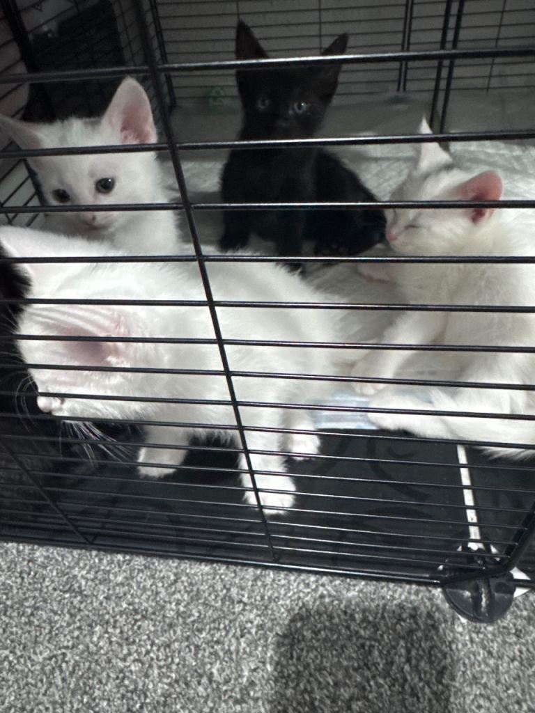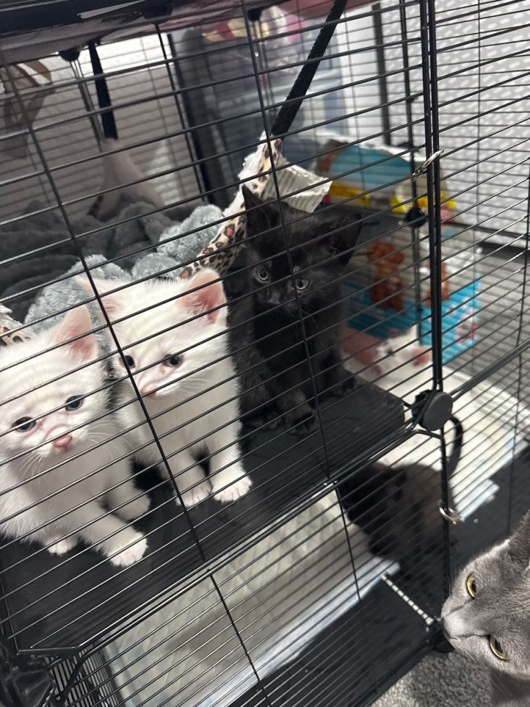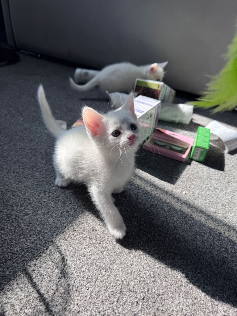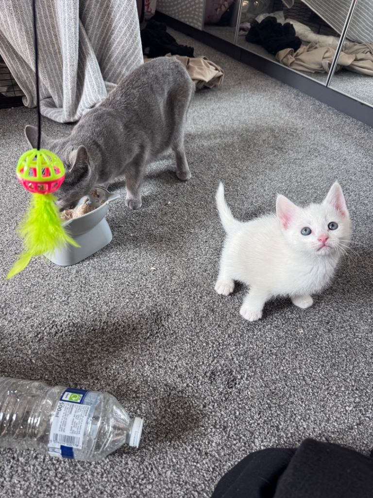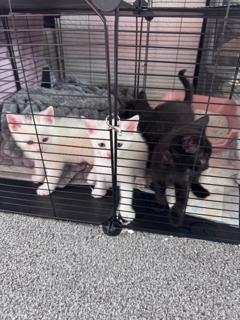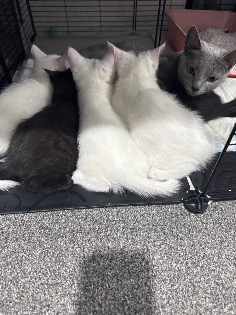 Cute little Black Russian blue male kittens two white kittens two white kittens male need a loving home and welcoming homes mother is a pure Russian blue, very playful and energetic been litter trained and weaned, deflead and wormed treatements come with own litter tray and food bowl, very playful and friendly, also if local willing to drop kitten off