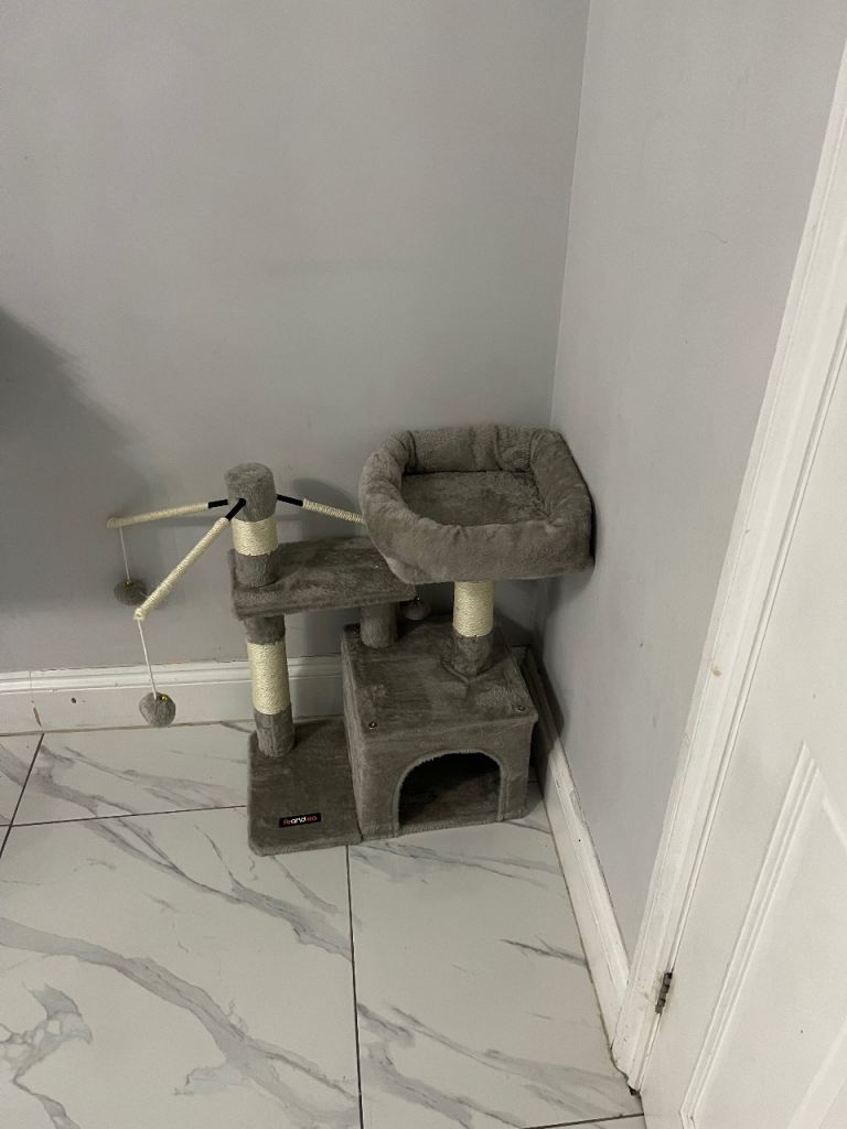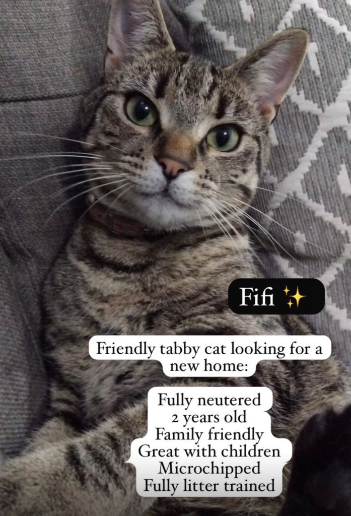 Fully neutered female tabby cat, fully litter trained, stays both inside and outside depending on the weather. 2 years old very friendly, cuddly and playful, great family pet and good with children. Name is Fifi, comes with bed and scratcher toys.